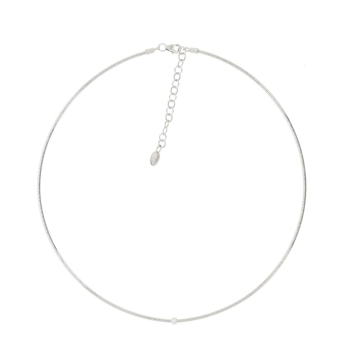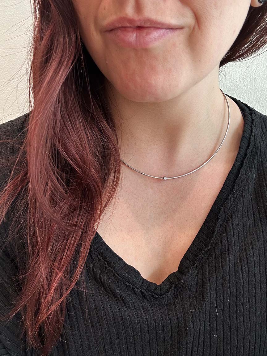 From Pesavento's DNA Spring Collection, this necklace is made out of rhodium plated sterling silver, crafted from a unique, flexible silver thread, with a silky feel and vibrant reflections, accented with a single bezel set white diamond at its center.