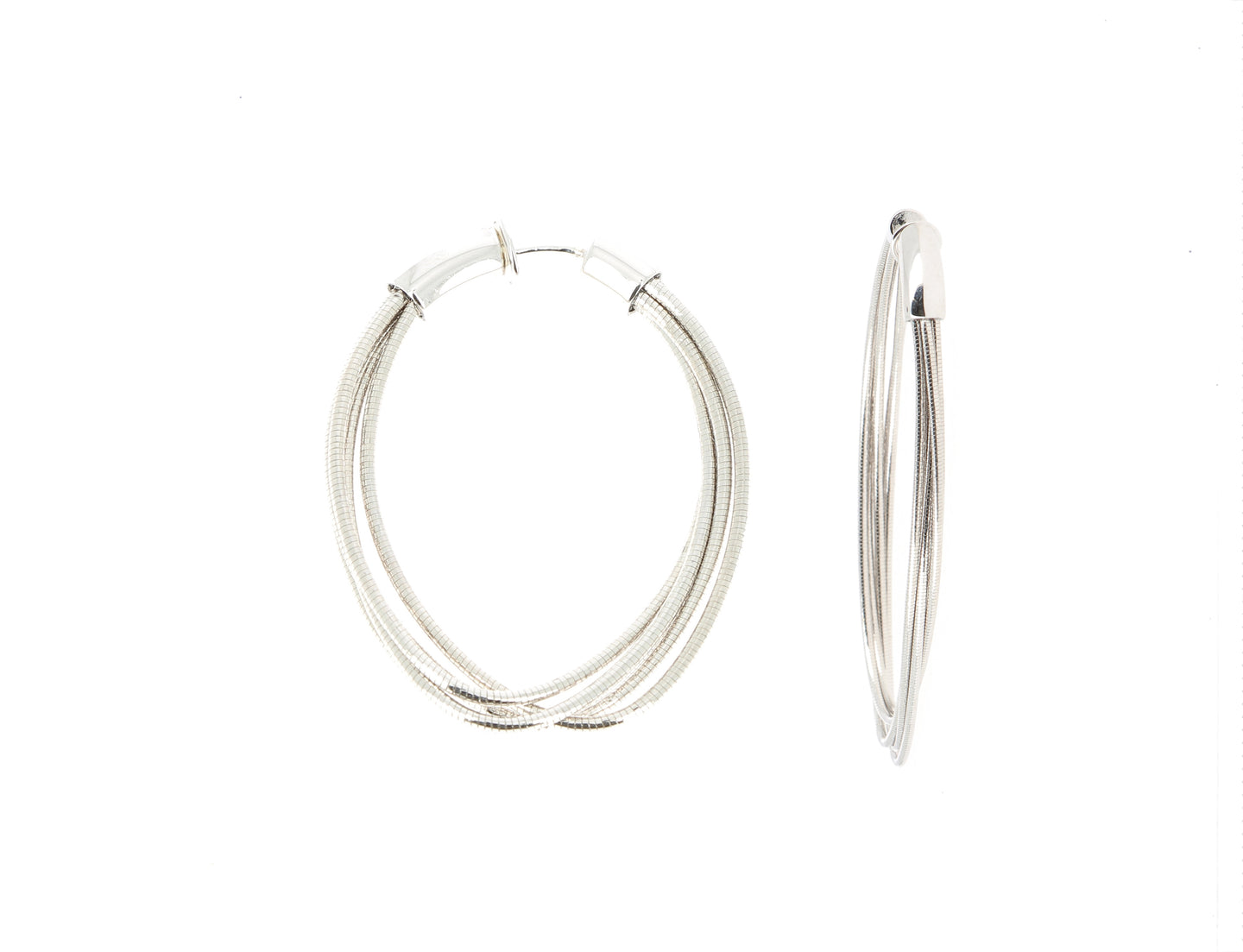 From Pesavento's DNA Collection, multi-strand rhodium plated sterling silver oval hoop earrings with spring action for flexibility.