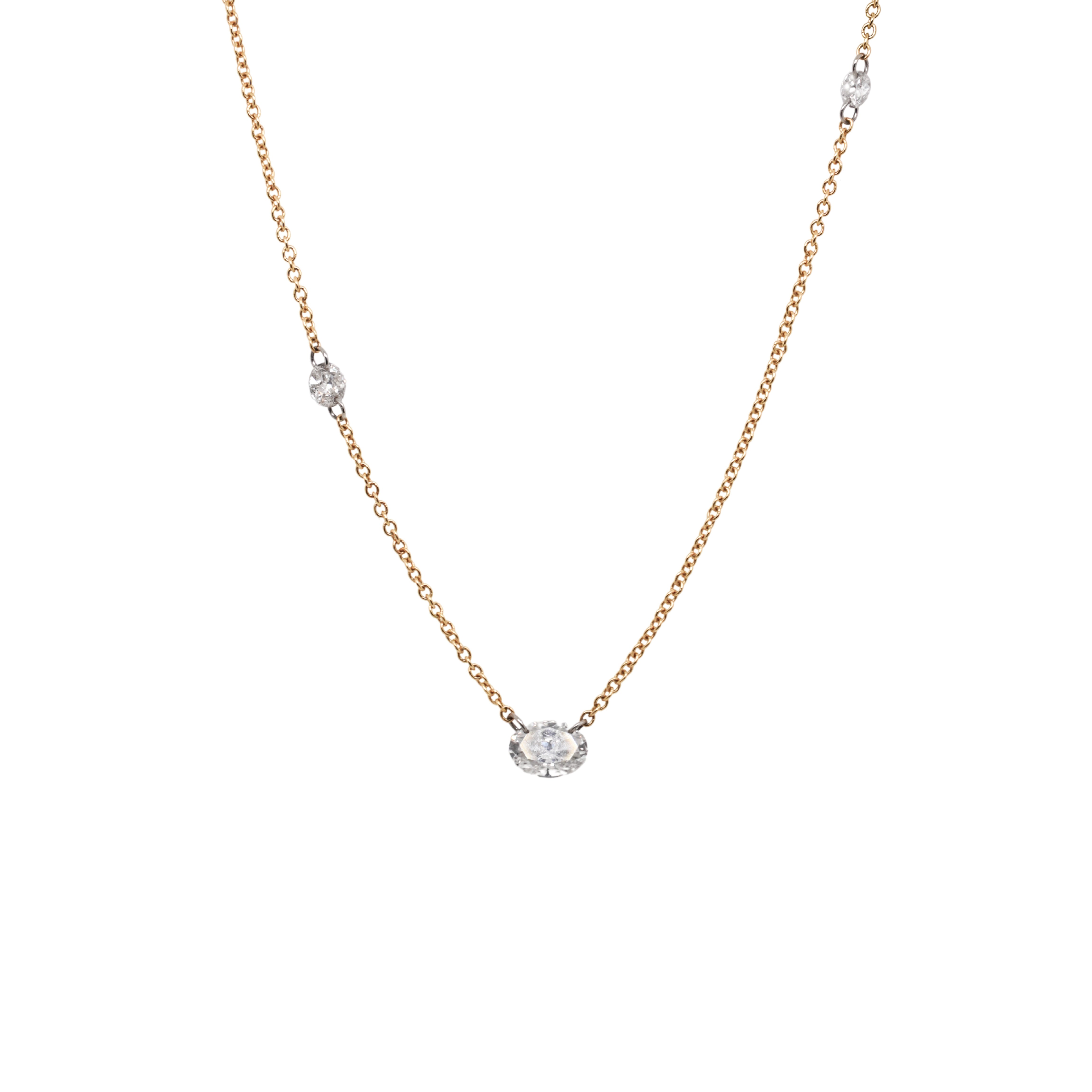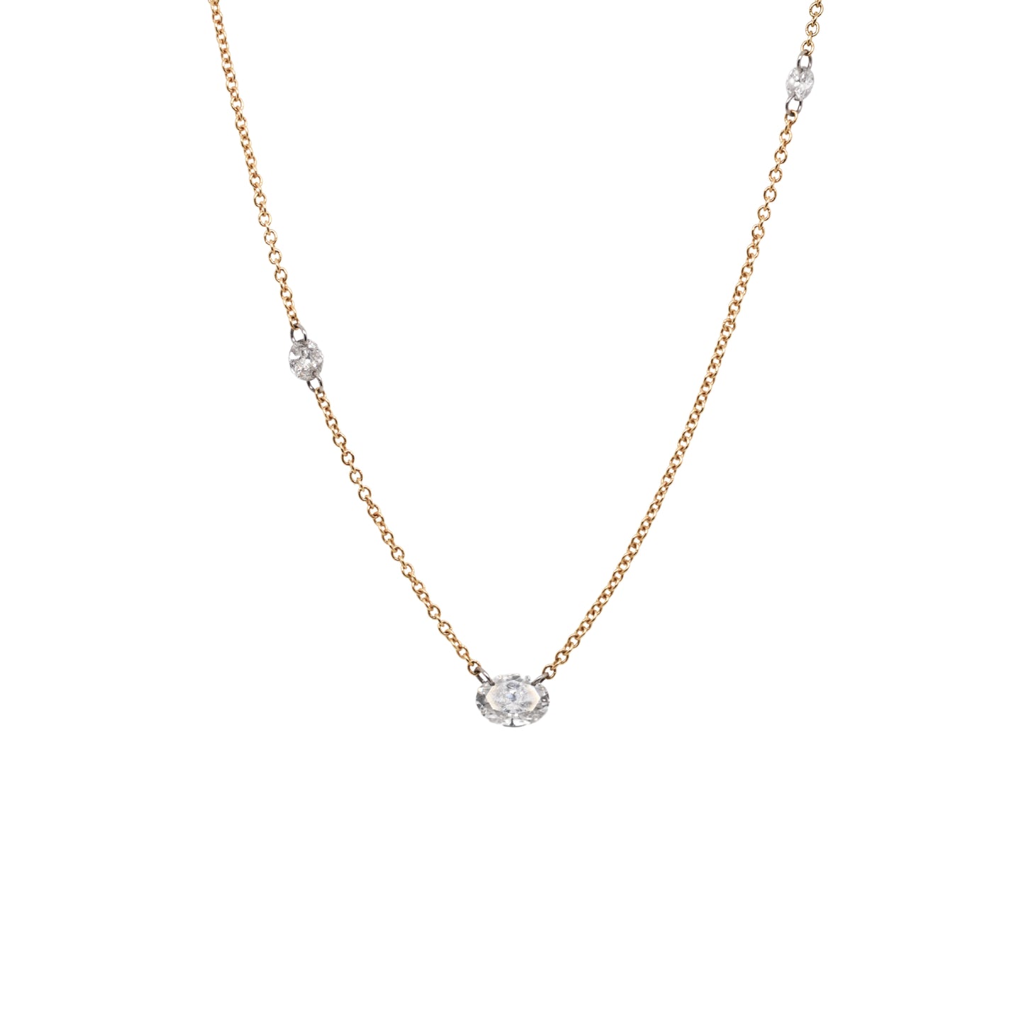 This delightful asymmetrical floating diamond necklace from TAP by Todd Pownell features one free-set .77CT oval diamond and two free-set round diamonds connected to an 18k yellow gold chain by platinum jump rings.