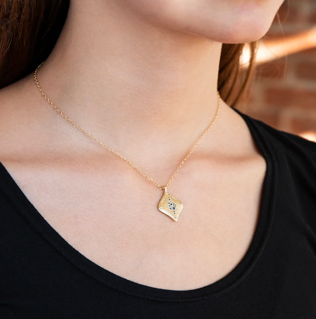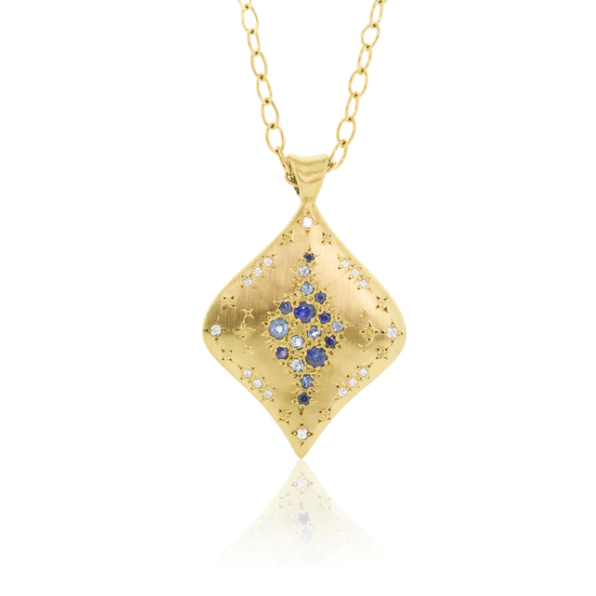 This exquisite pendant features a random pattern of sapphires and aquamarine stones complemented with diamond embellishments set in 18k yellow gold with a soft, satin finish. The unique combination of colors and textures will add the perfect amount of sparkle to your summer night look.