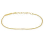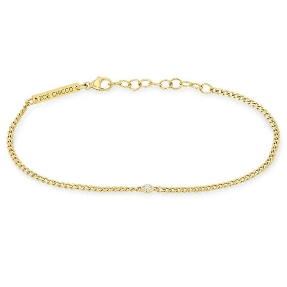 From Zoe Chicco, this bracelet is made out of 14k yellow gold featuring an extra small hollow curb chain bracelet with a single floating round diamond set in the chain.