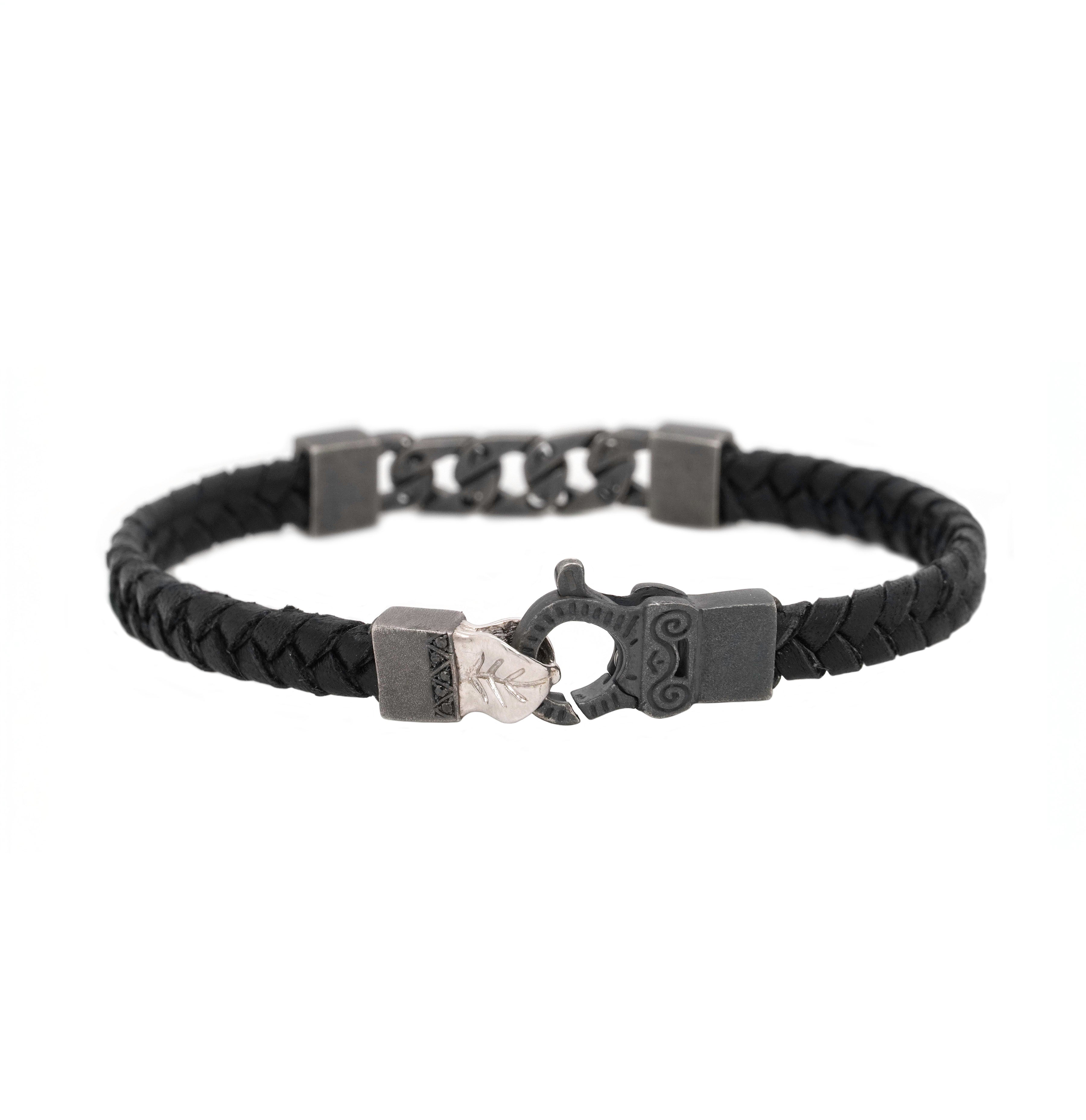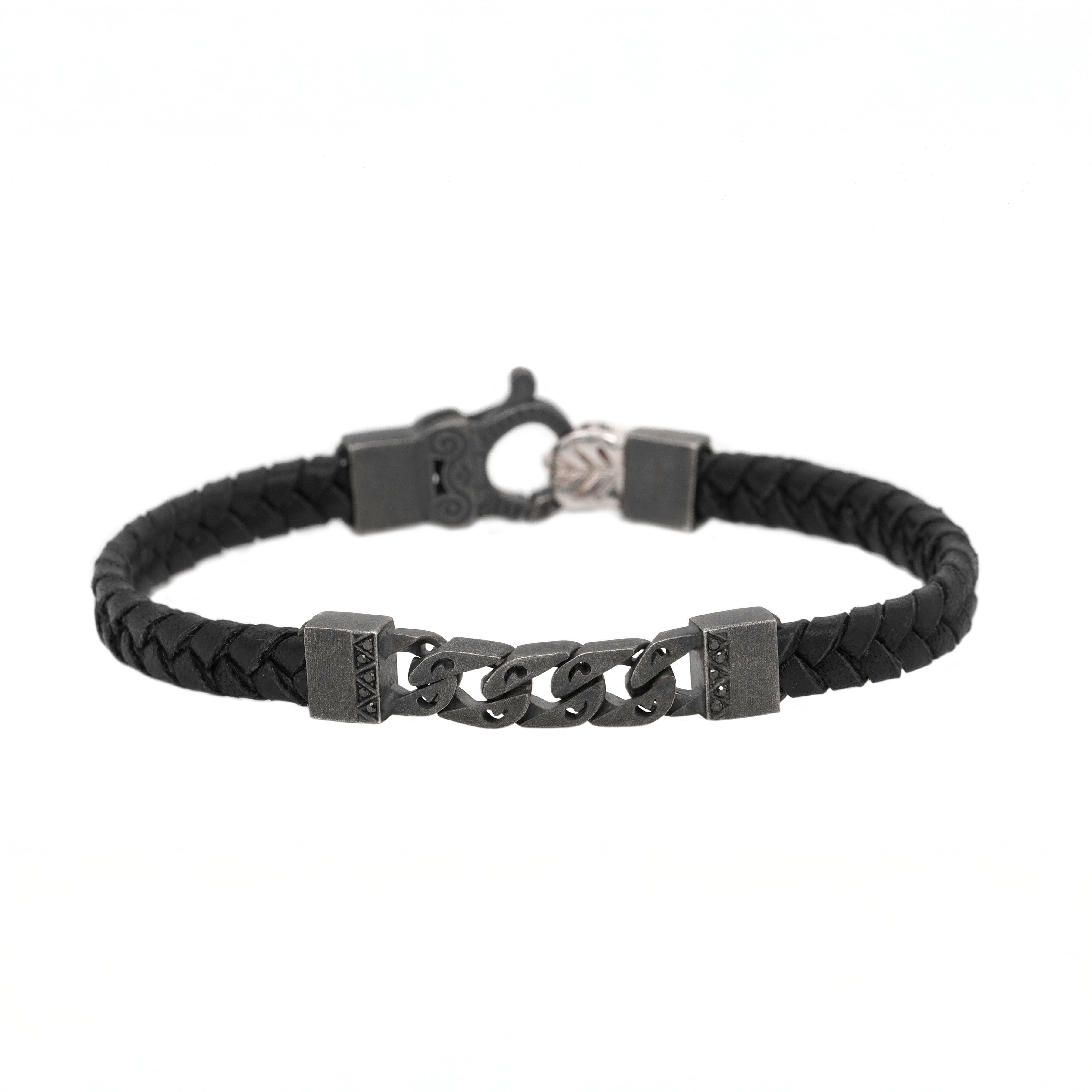 From Marco Dal Maso, this bracelet is made out of soft black braided Italian leather, oxidized sterling silver, and a bright rhodium plating over silver accent, featuring two small rows of black diamonds.