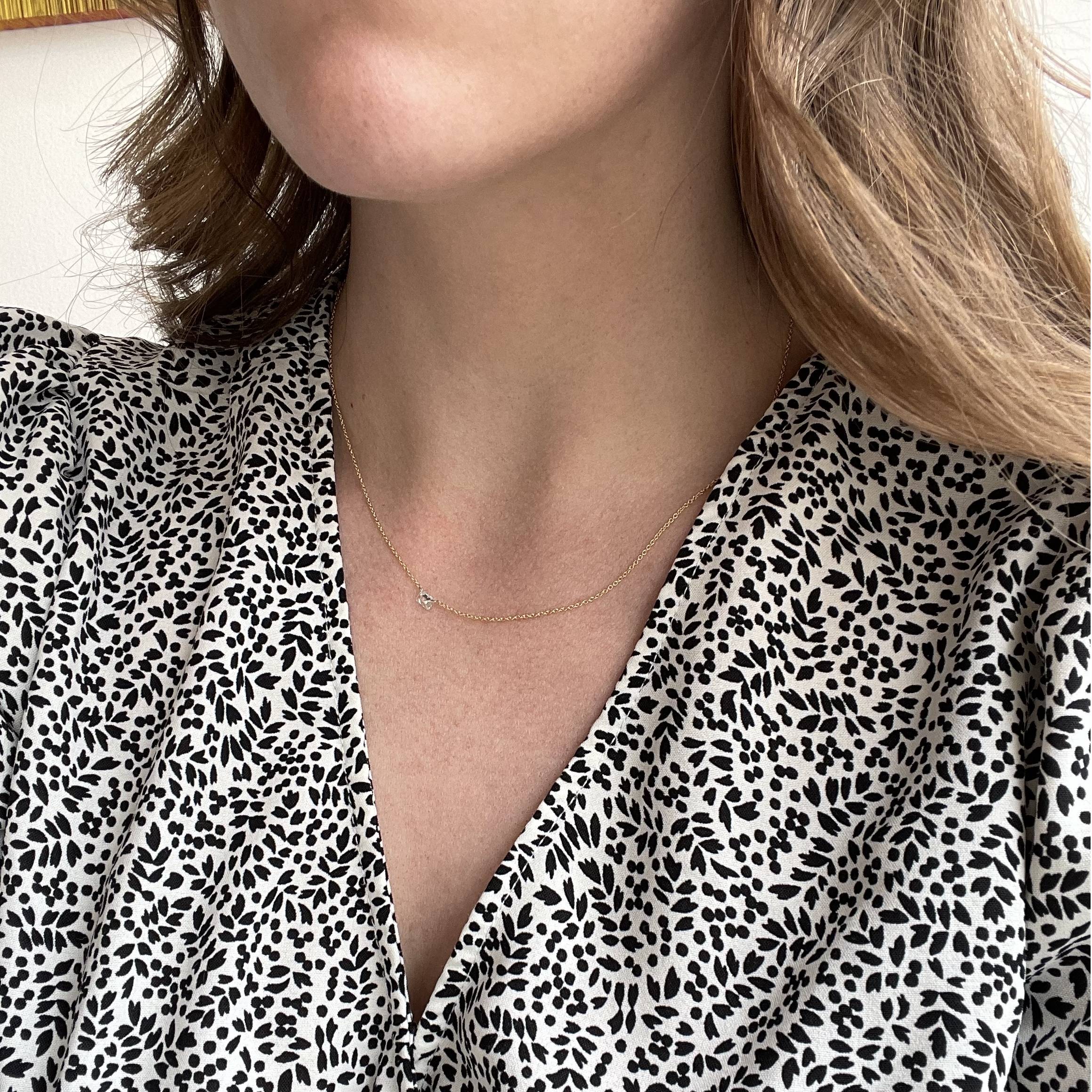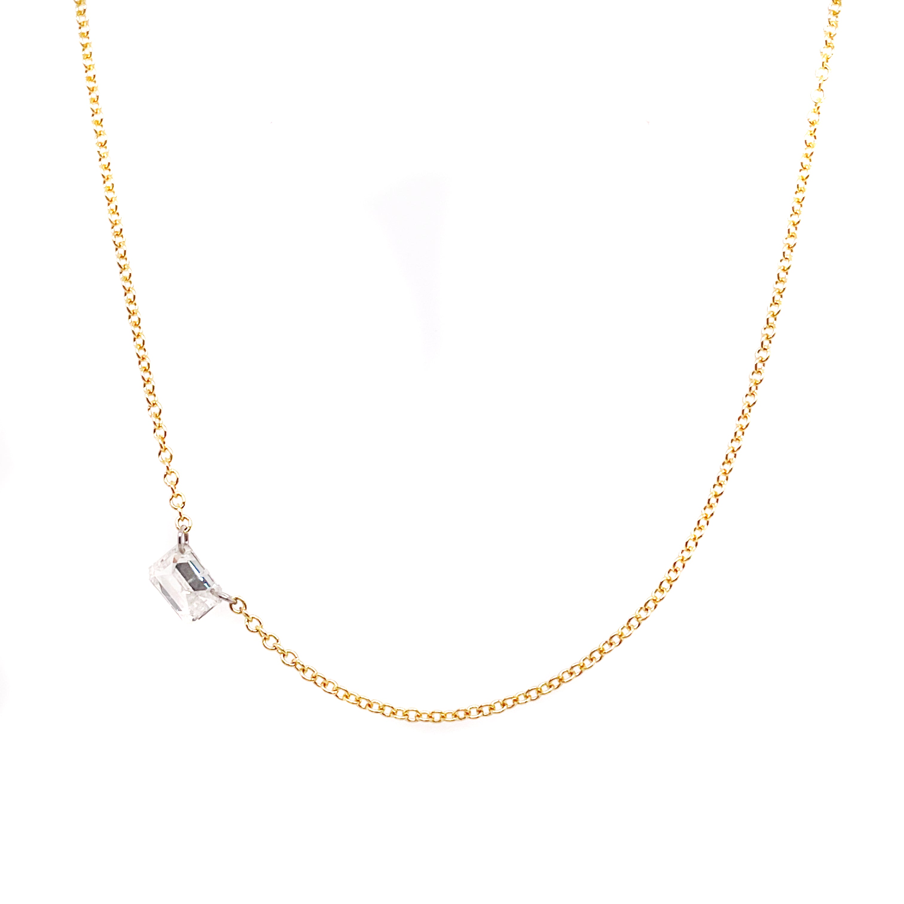 From TAP by Todd Pownell, a 1mm 18k yellow gold cable chain highlights a single 0.36ct emerald cut diamond that has been inverted on platinum jump rings.