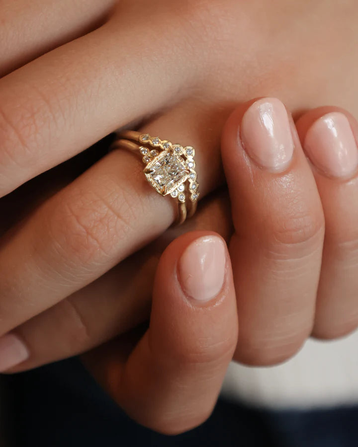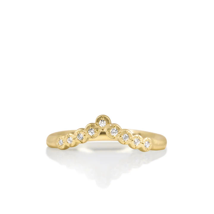 From Adel Chefridi, this nesting v shaped ring is made out of 18k yellow gold and diamonds. A beautiful piece solo and the perfect stacking band for a low profile center stone ring.