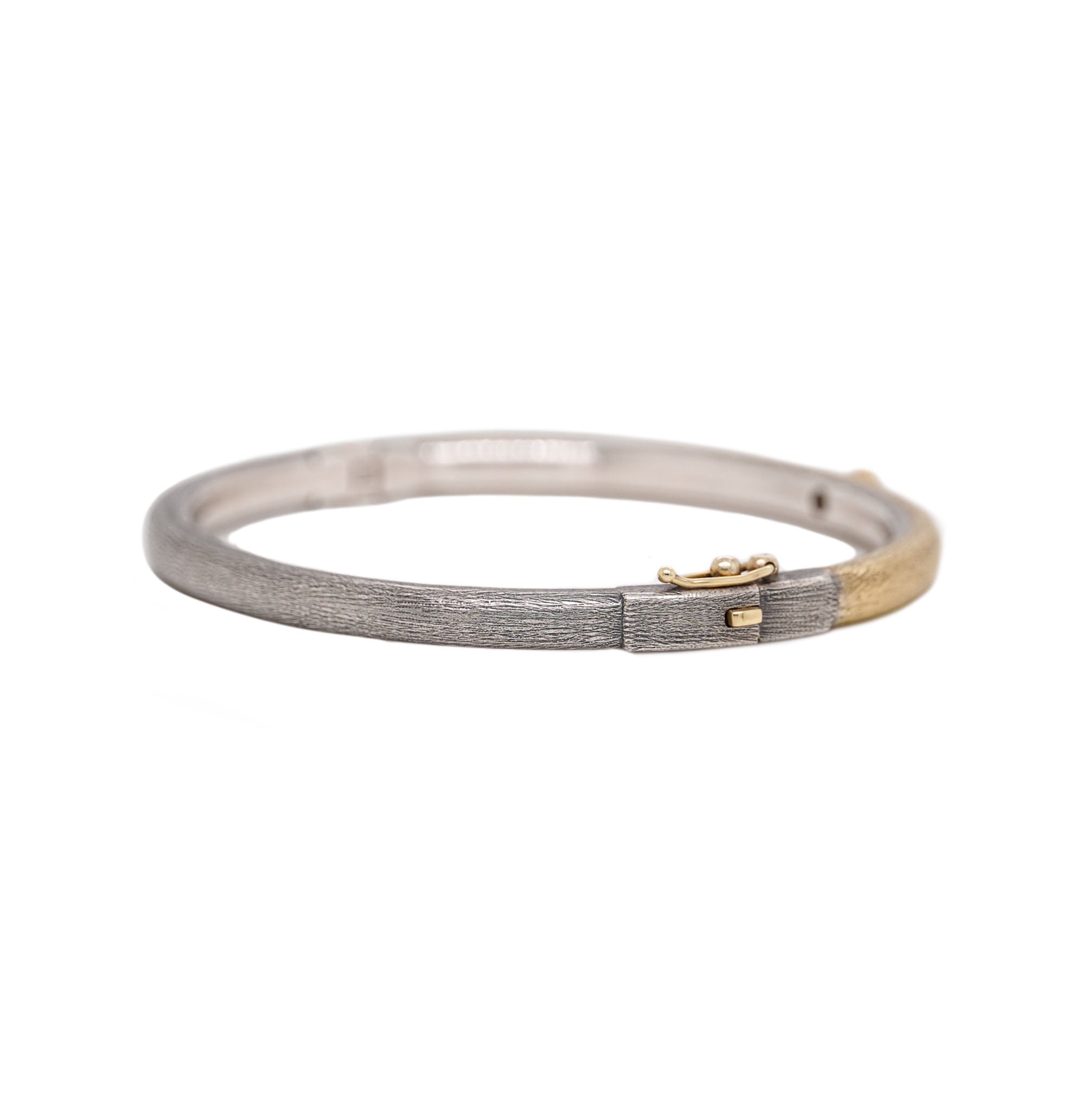 From Rene Escobar, this bangle is made out of mixed metals, featuring one side with 18k yellow gold and a single, bezel set white diamond. The other side features simple, textured sterling silver, finished with a beautiful hand crafted snap catch closure.