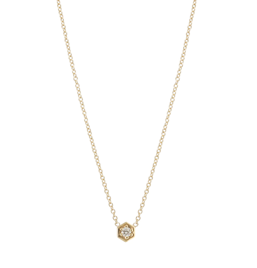 14k yellow gold chain necklace with a hexagonal pendant and a round white diamond set in the middle.