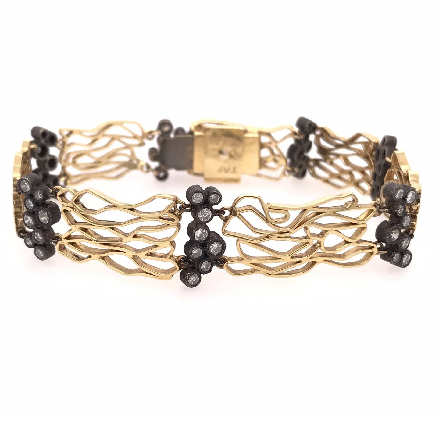 A beautiful open 18K yellow gold "flame" pattern by TAP by Todd Pownell is connected by bezel set inverted diamond clusters set in oxidized 14K white gold.