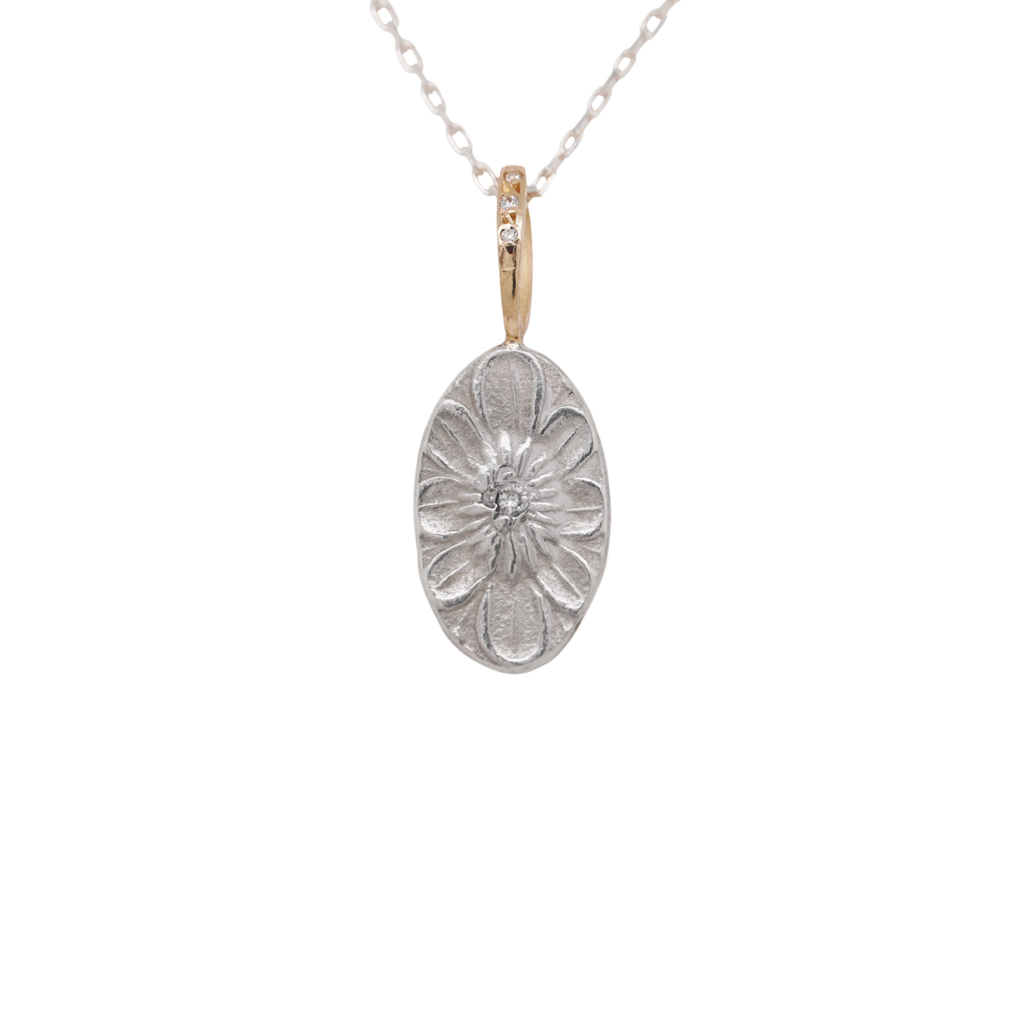 This necklace from Robin Haley features a sterling silver pendant cast from an artifact from England circa 1920 AD. The pendant features a sparkling white diamond set in its center and a 14k yellow gold bail adorned with brilliant pave set diamonds, hanging from an 18" sterling silver chain.