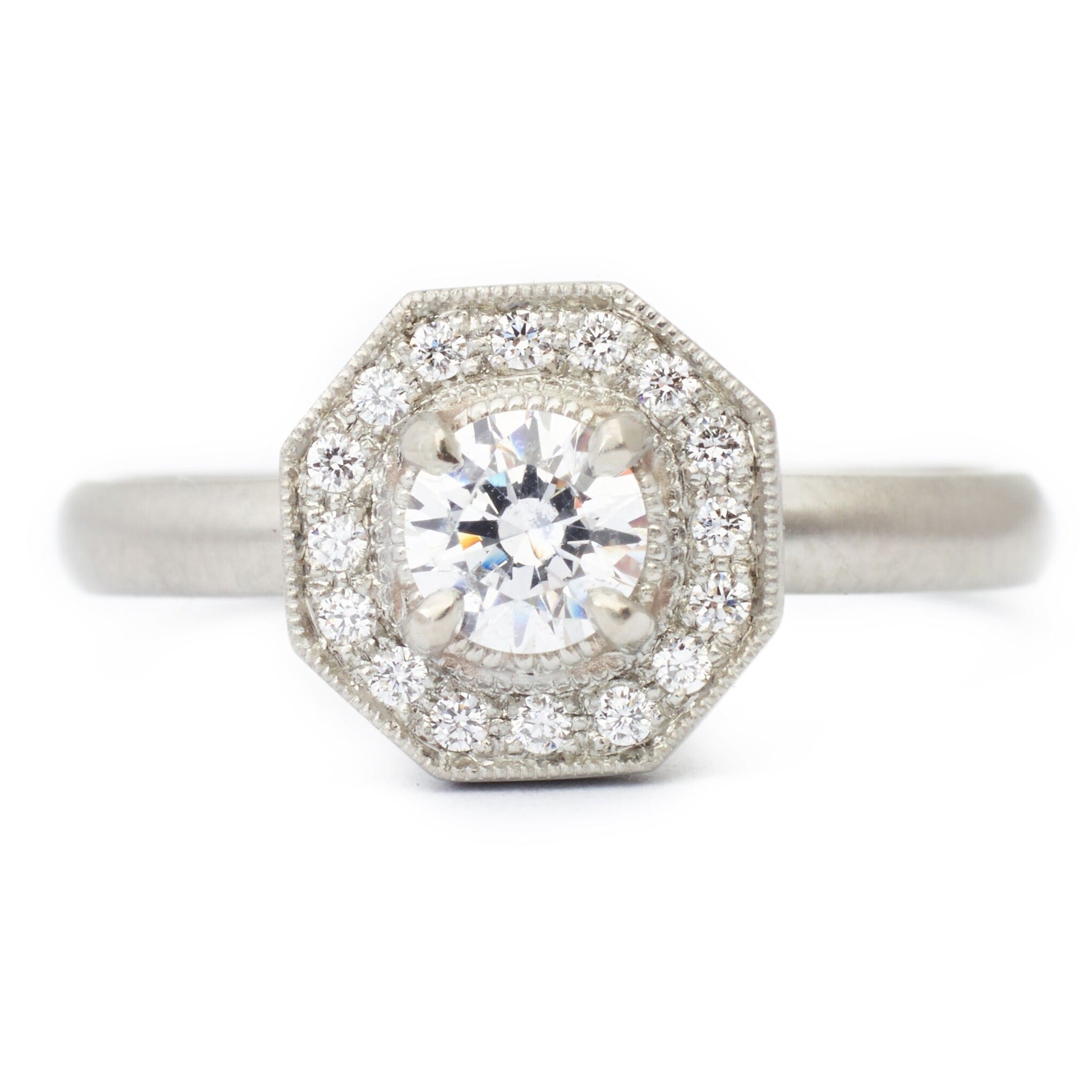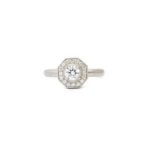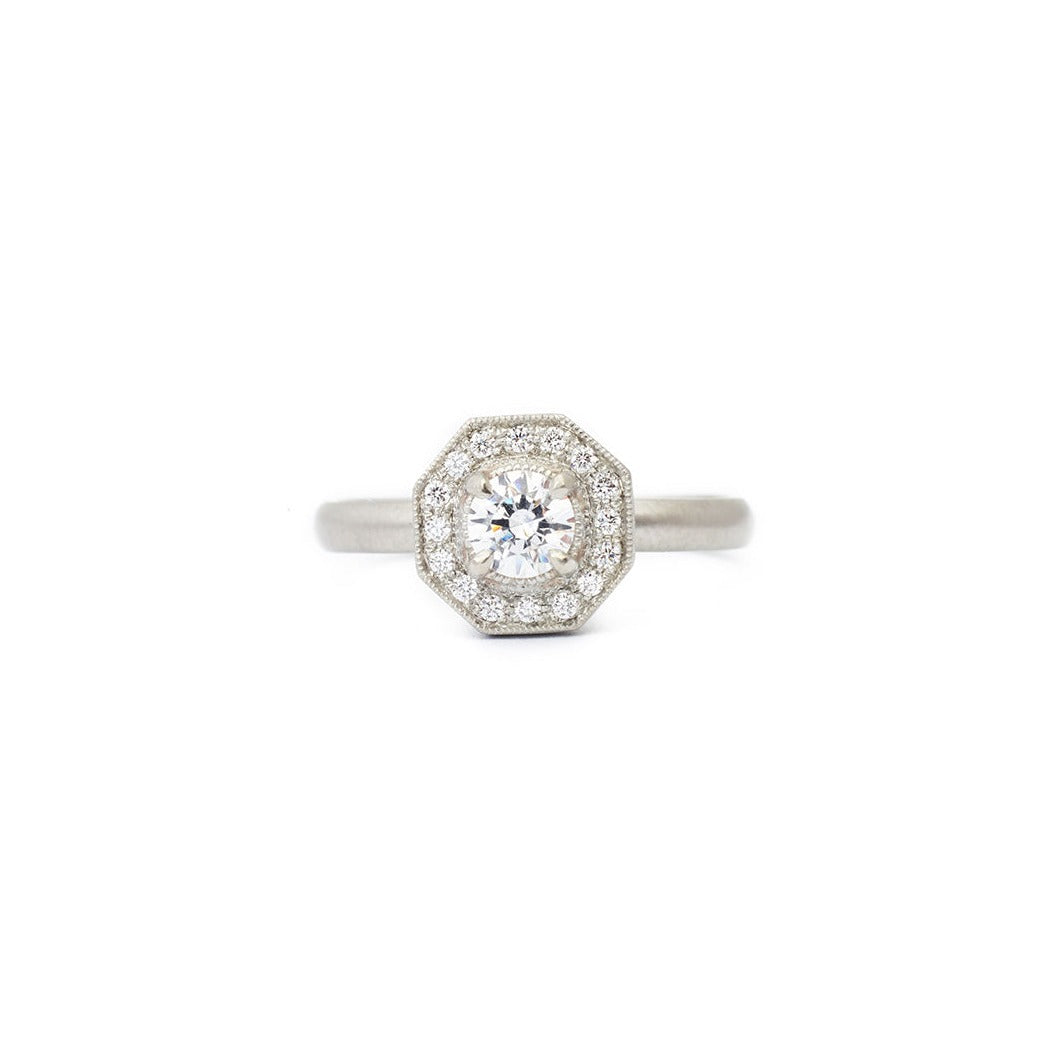 Anne Sportun's 'Hedy' ring in 14k white gold set with a diamond center stone, 0.33ct surrounded by a octagon halo of 16 diamonds, 0.08 total carat weight. Price includes center stone.