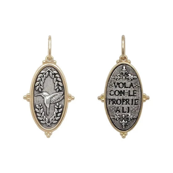 From Erica Molinari, this charm is made out of 18K yellow gold and sterling silver. The front features a small hummingbird surrounded by vines. The reverse side has the phrase "Vola con le proprie ali" is engraved, translating to "She flies with her own wings." This image shows the front and back of charm.