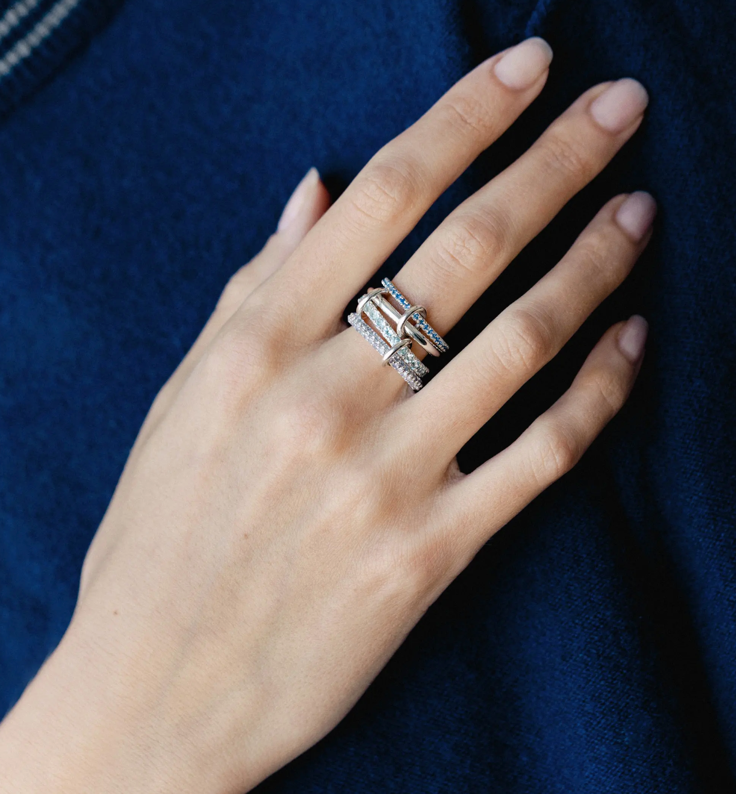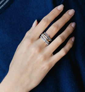 The Iris is constructed entirely from .925 sterling silver and features four luminous bands, three of which are pavé-set with gemstones. Medium blue sapphires, aquamarine and tanzanite stones mirror the spectrum of blue tones found in cascades of iris petals. Tactile, orbiting connectors of solid .925 sterling silver link each band together, making the Iris perfect for wearing stacked or across multiple fingers.
