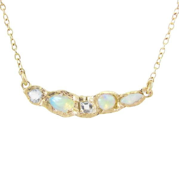 For the magical spirit who loves to collect dreamy treasures along the journey, this necklace from Misa Jewelry features delicately set opal and aquamarine stones set in 14K yellow gold.