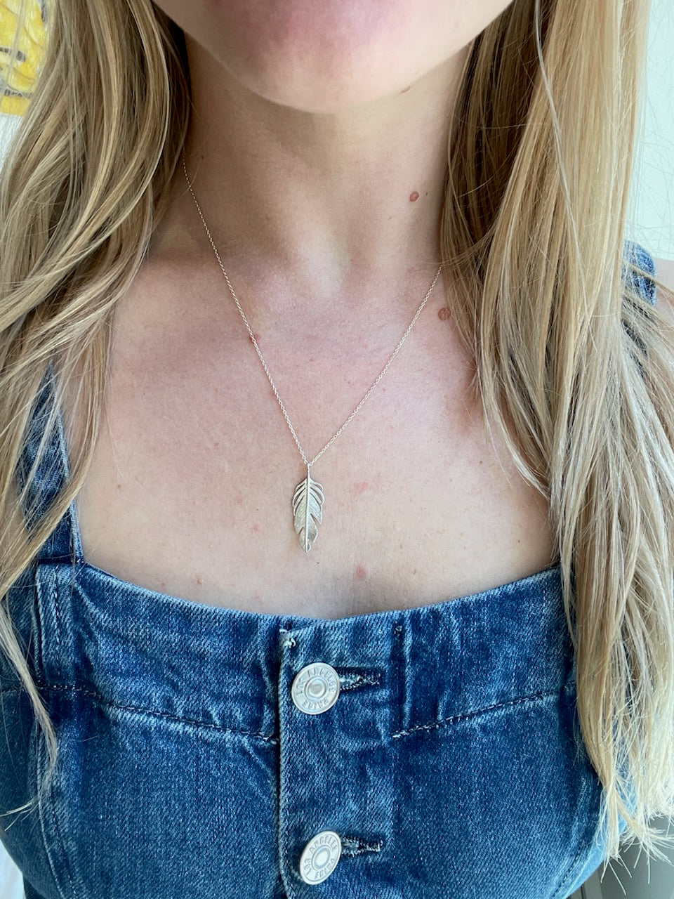 A classic Annette Ferdinandsen style, this large feather pendant necklace is rendered in sterling silver.