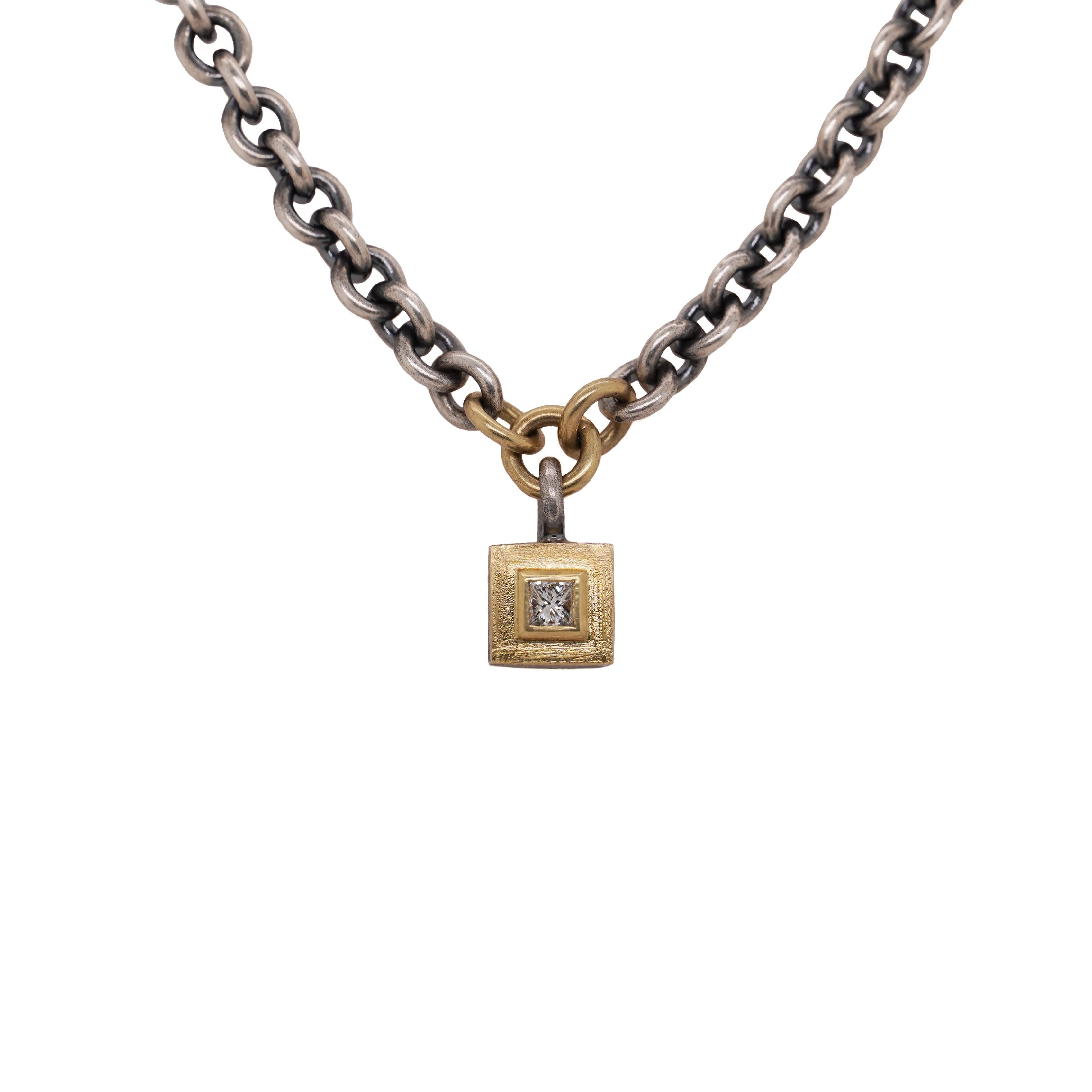 The Princess Necklace by Rene Escobar is made out of oxidized and textured sterling silver and 18k yellow gold, featuring a bezel set princess cut white diamond in the center of the pendant.