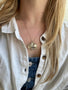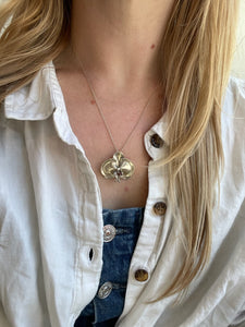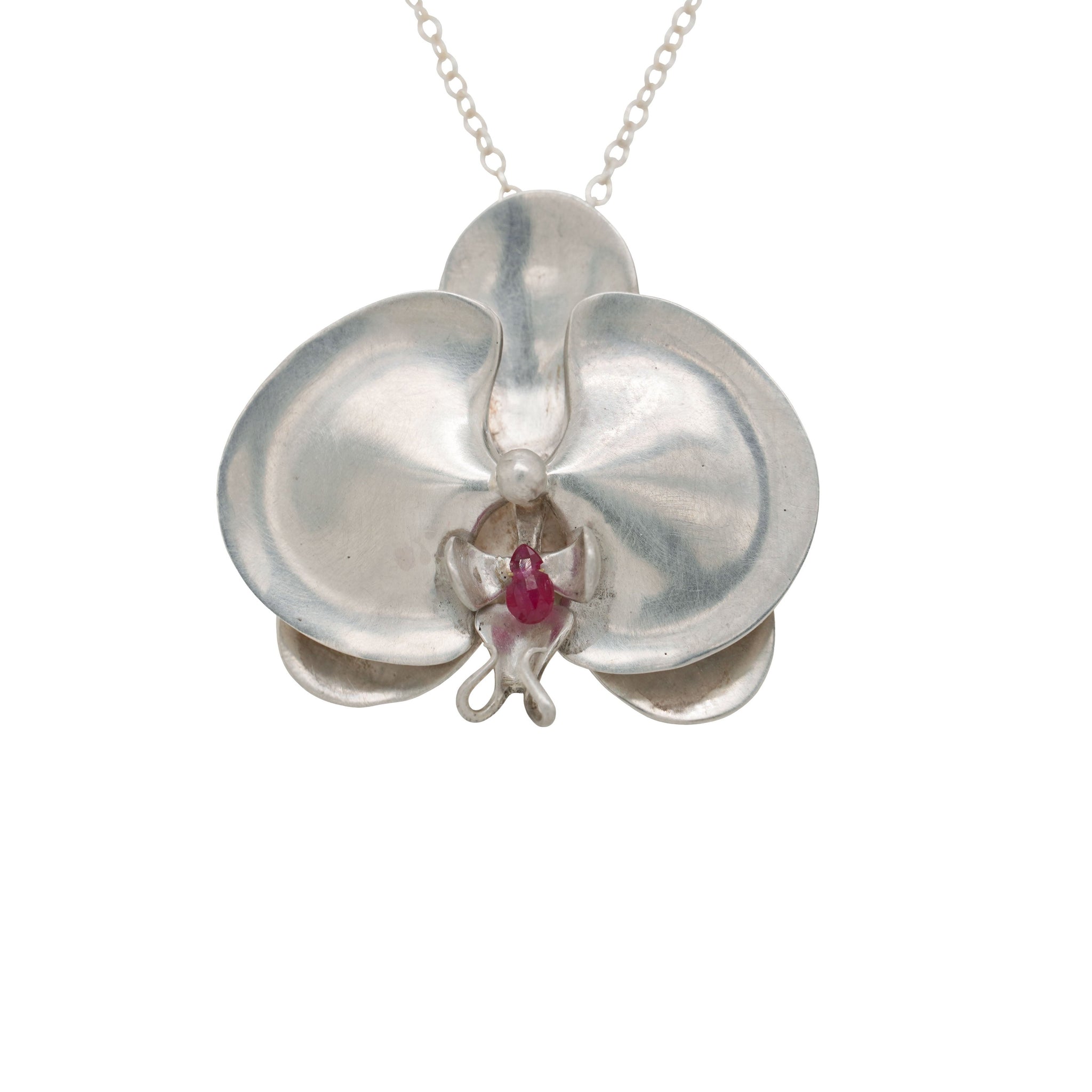 From Annette Ferdinandsen, this beautiful necklace is made out of sterling silver and features an orchid flower with a small ruby at its center.