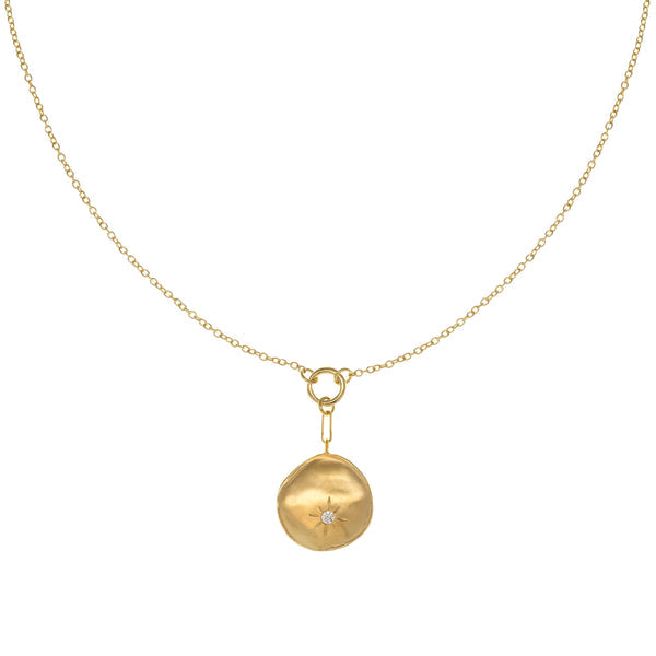 From Anne Sportun, a dazzling diamond is placed off-center on an organic coin pendant.