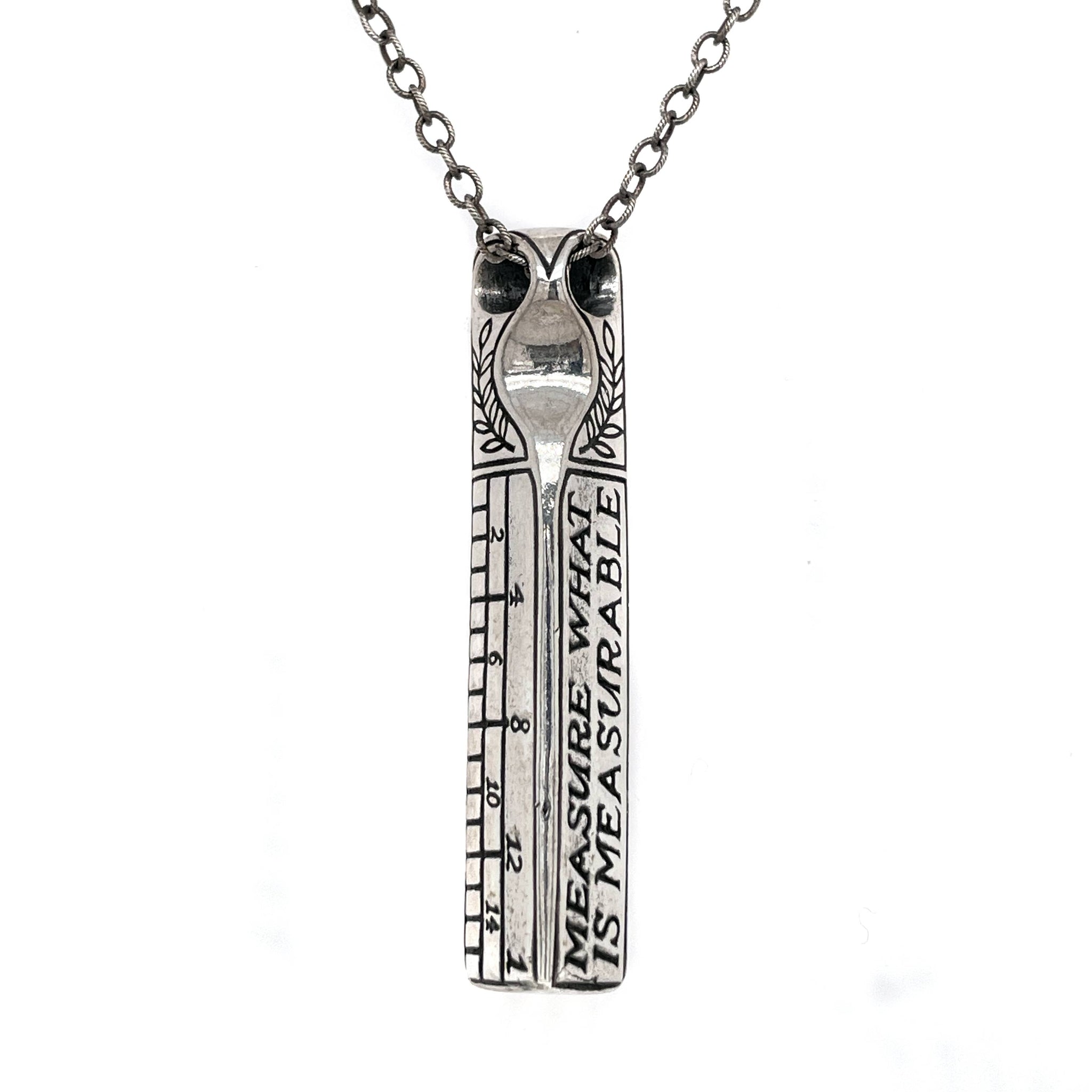 This sterling silver Make Measurable pendant from Digby & Iona is a miniature one inch rule engraved with 'Measure What is Measurable, Make Measurable What is Not' a classic quote from Galileo. Pendant hangs from an oxidized sterling silver chain.