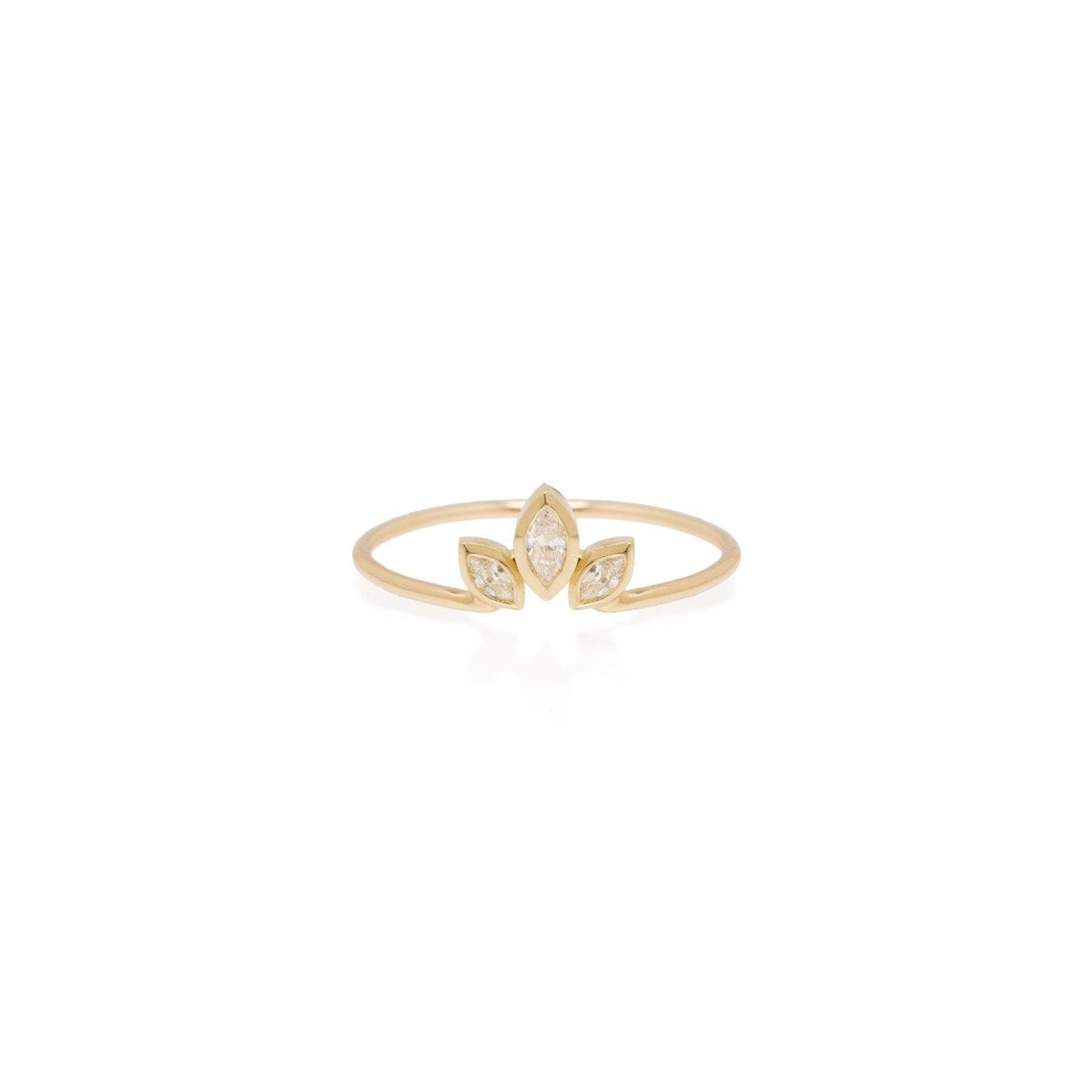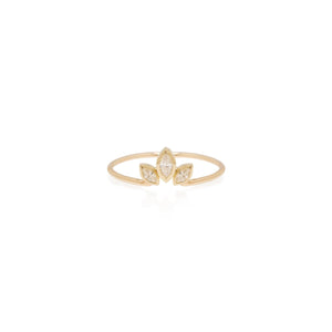 14K yellow gold fan ring with graduated white marquis diamonds.