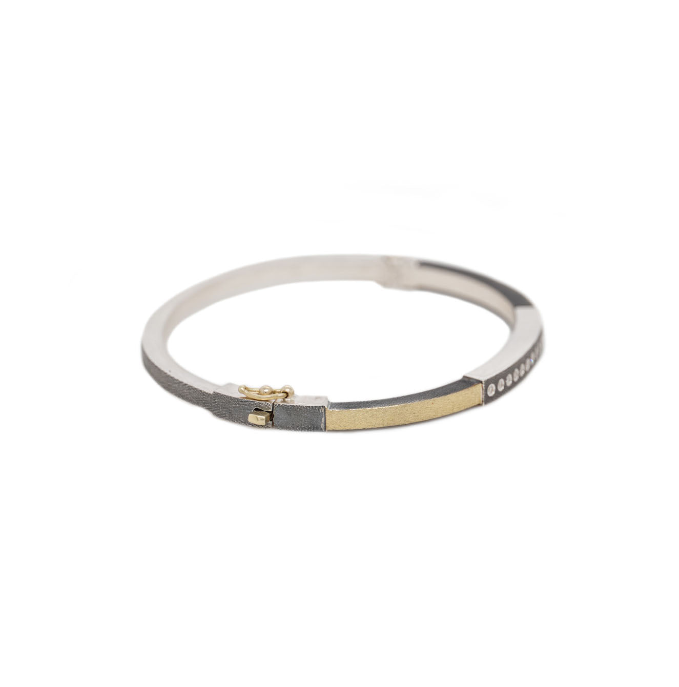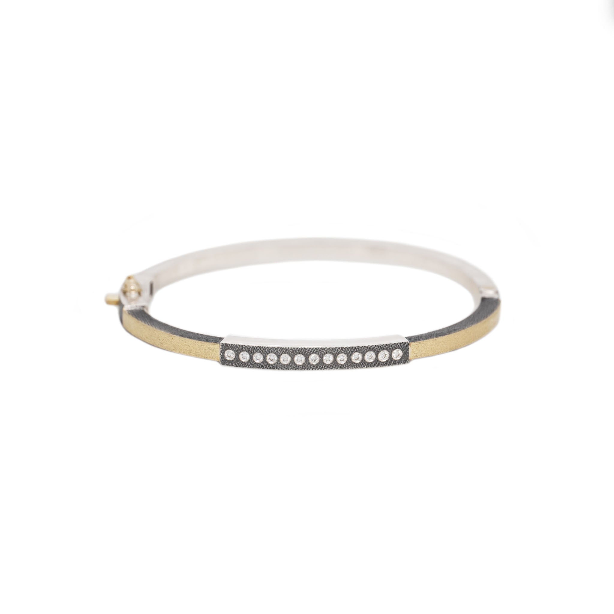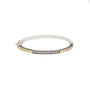 From Rene Escobar, this bangle is made out of sterling silver and 18k yellow gold, featuring a bar of diamonds on the front of the design, finished with an 18k yellow gold snap catch closure.
