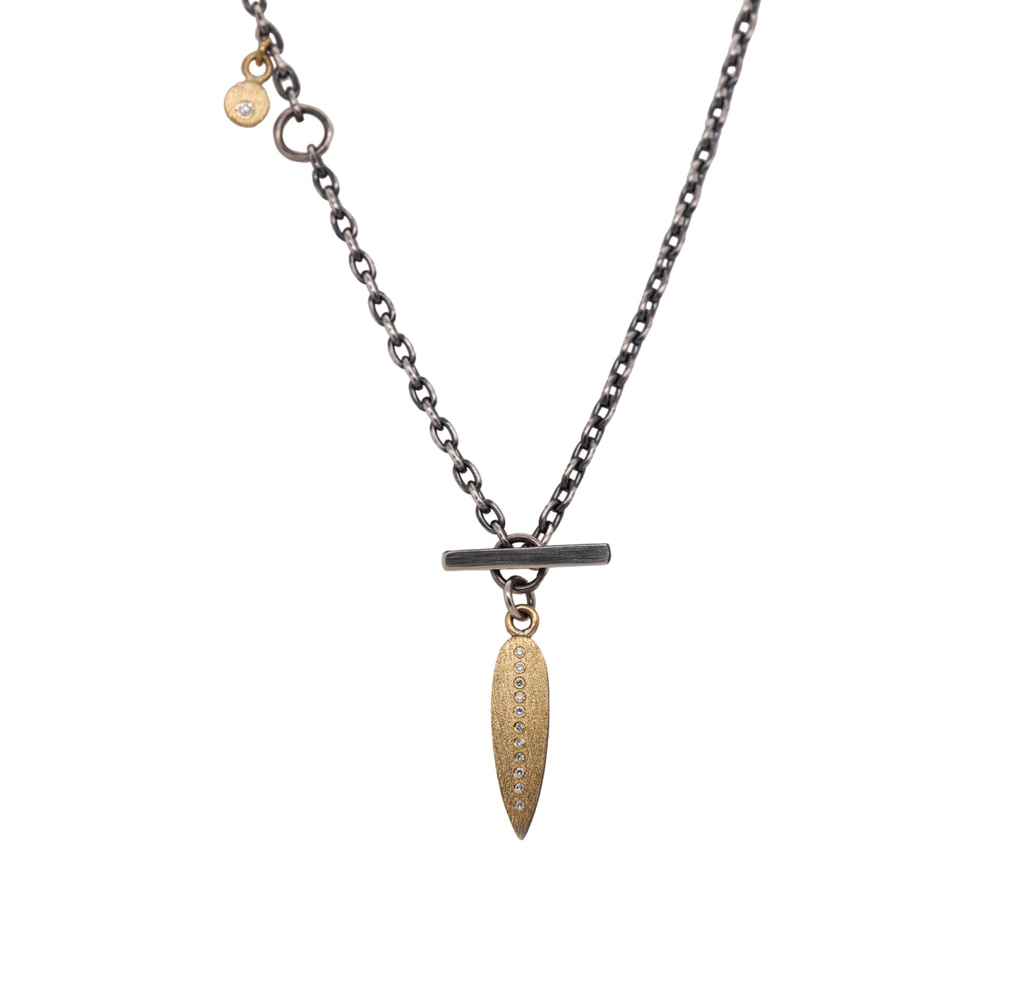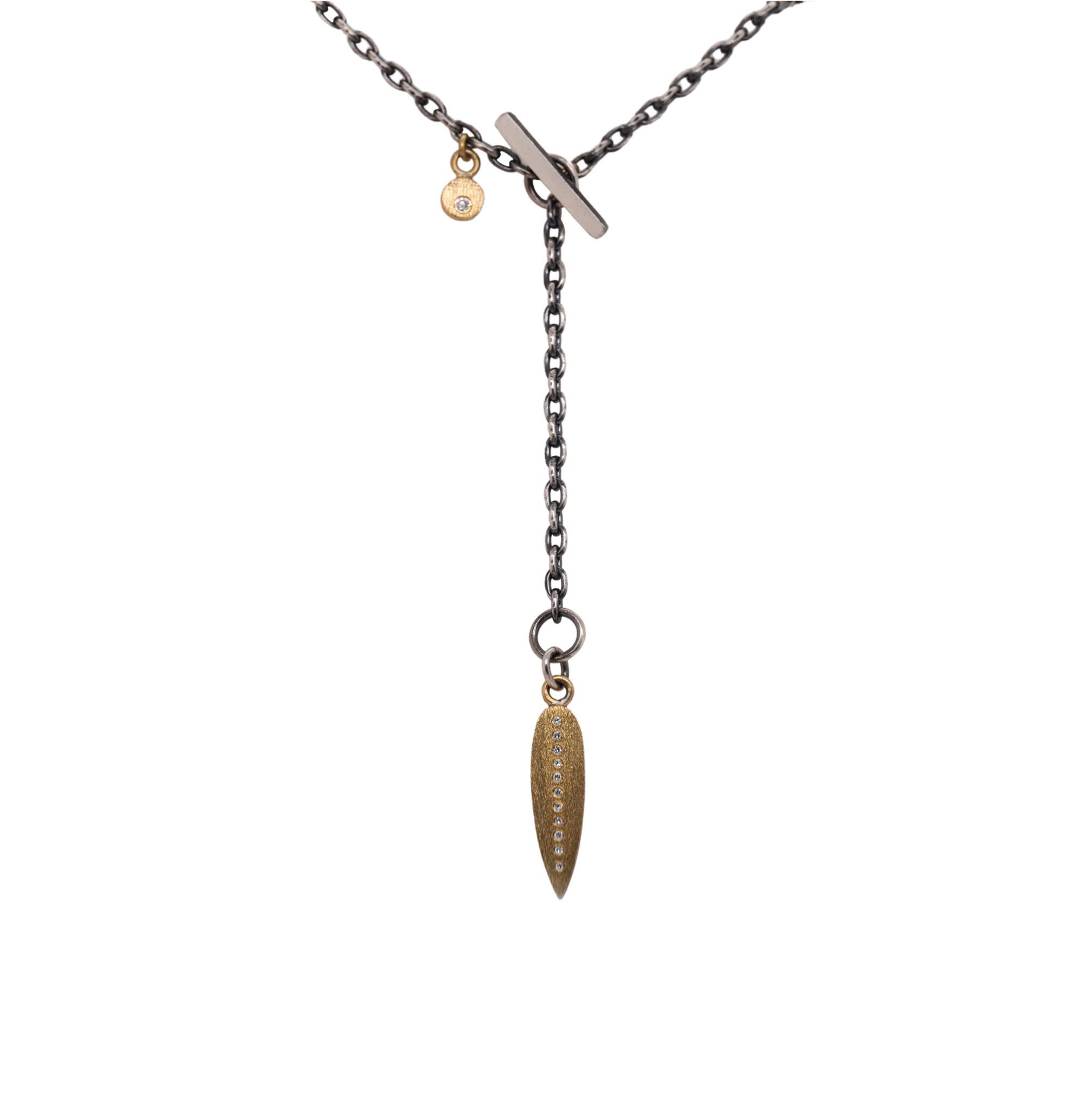 The Small Palaso Lariat Necklace by Rene Escobar is made out of oxidized and textured sterling silver, set with multiple white diamonds ( 0.04 tcw ), featuring a 18k yellow gold leaf pendant.