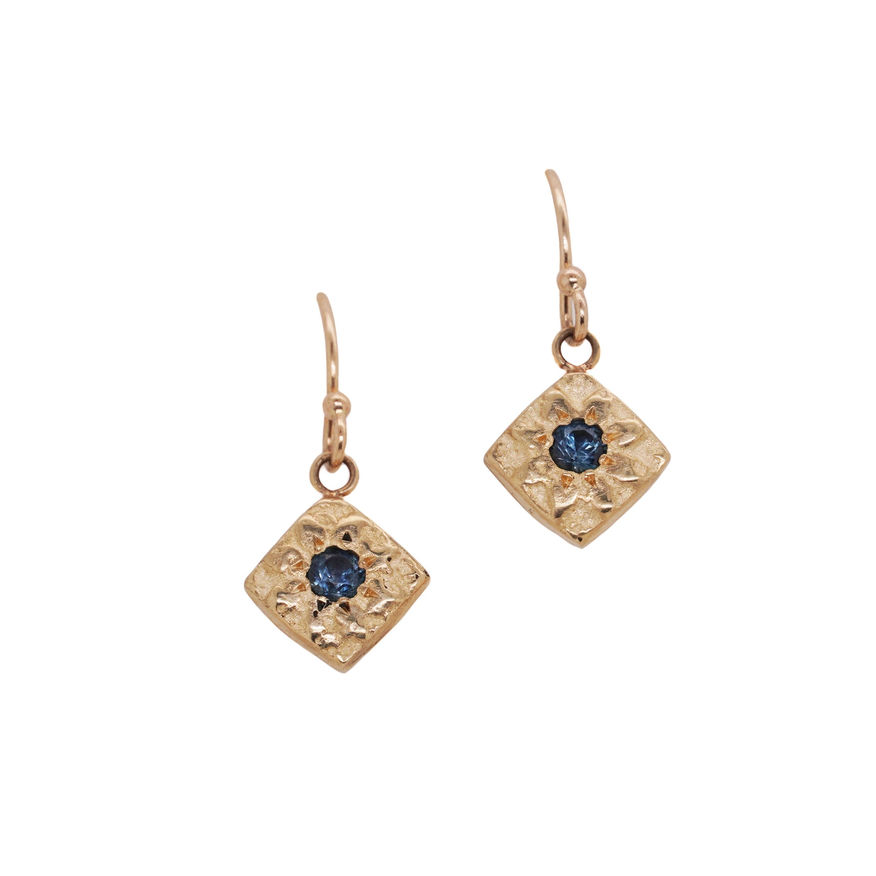 These 14K yellow gold earrings by Robin Haley are based off of an artifact from South America circa 1600. A single moody slate blue Montana sapphire graces the center of each earring.