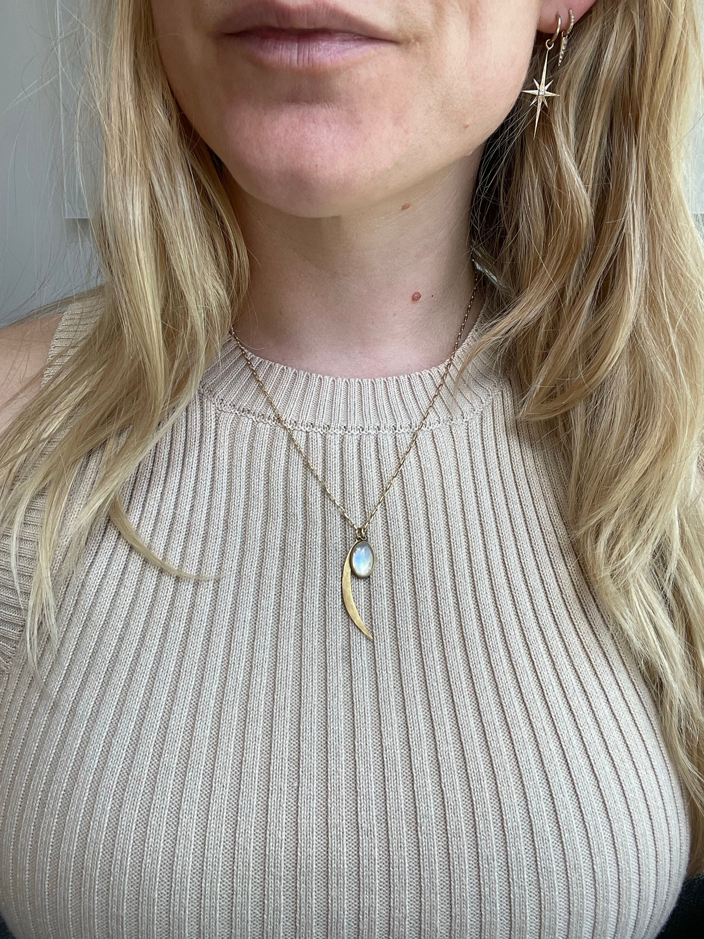 This dreamy moonstone cabochon is set in a 22K yellow gold bezel with a sterling silver back and hangs alongside a 22K hammered crescent gold moon charm on a delicate paperclip chain.
