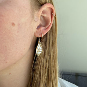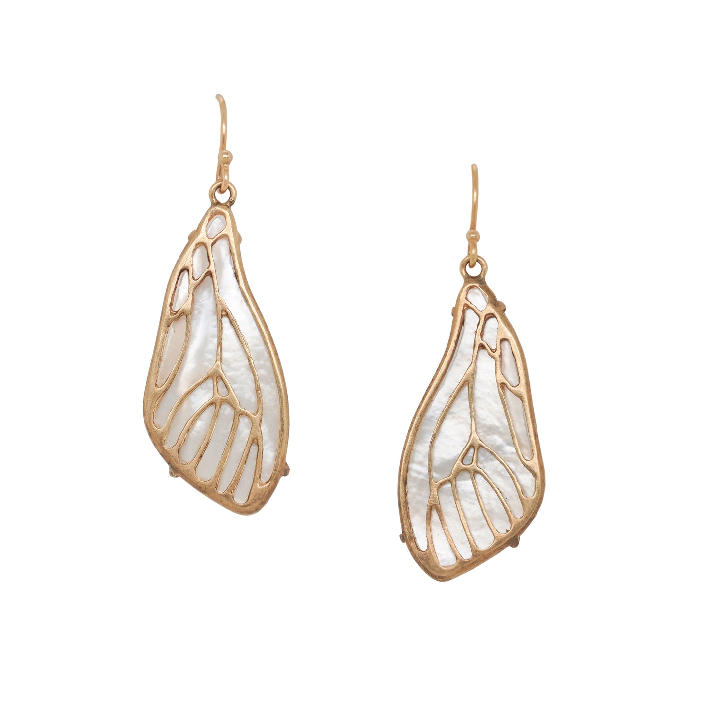 From Annette Ferdinandsen, these winged earrings are made out of 14k yellow gold with mother of pearl behind the gold silhouette of the fly wings.