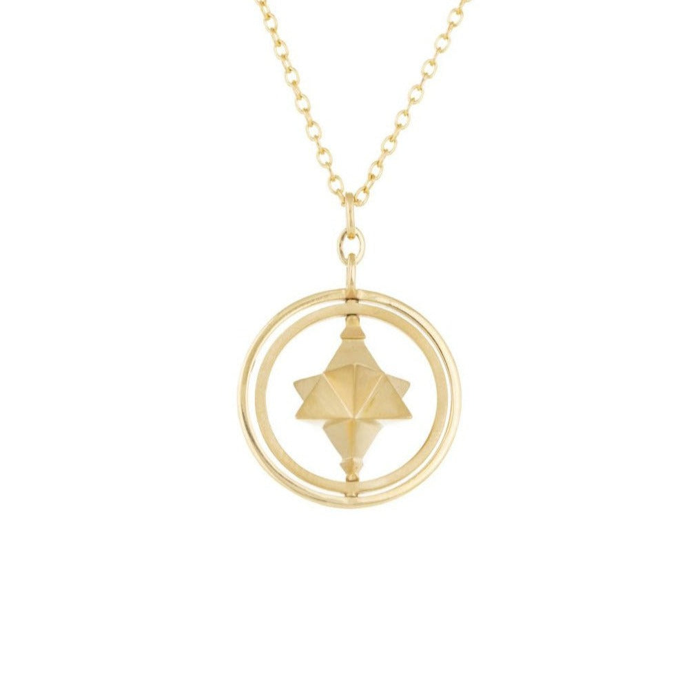 By Celine Daoust, this 14k yellow gold pendant showcases her moving star merkabah design.