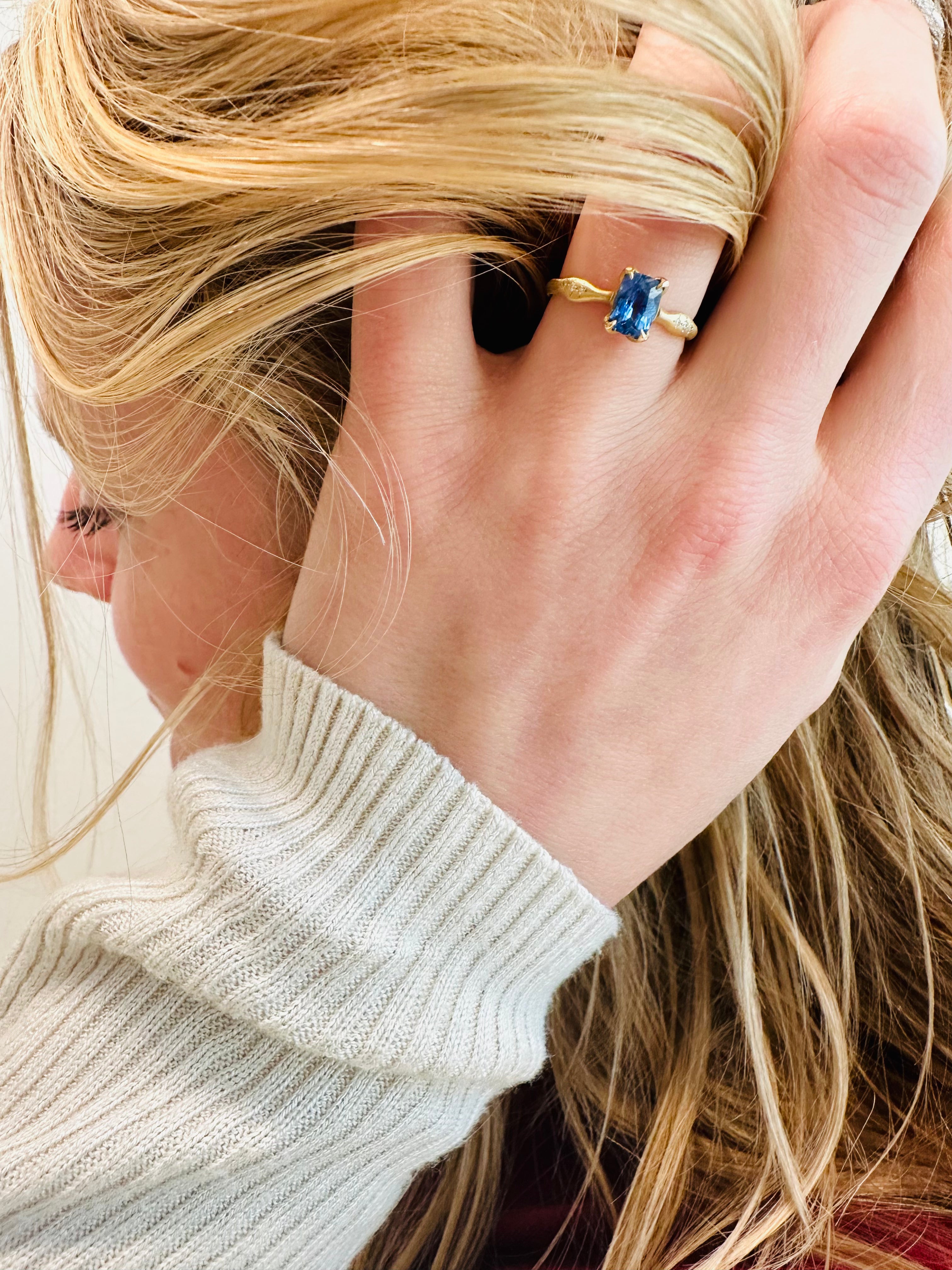 This Natural Blue Sapphire Ring is a stunning piece of jewelry, crafted with an emerald cut sapphire and 18k yellow gold. It's complete with white diamonds on the band that add sparkle and shine to the piece. The sapphire is carefully chosen and expertly cut, allowing light to gracefully pass through its beautiful blue hue.