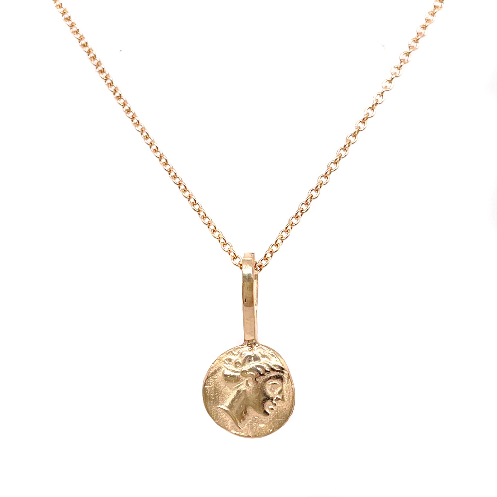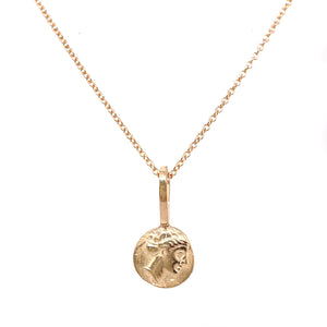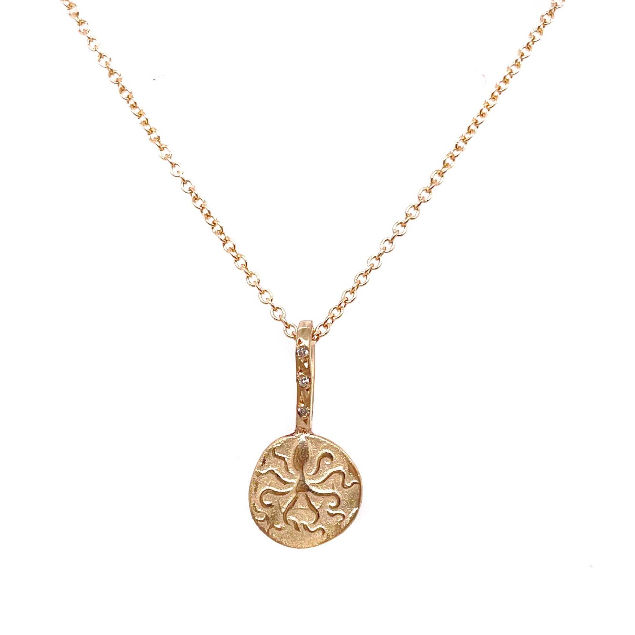 This 14K yellow gold necklace from Robin Haley's artifact collection features a reversible pendant, cast from an ancient coin. One side has an octopus motif, and the other has a woman's profile. The bale is set with 3 brilliant cut diamonds, and the pendant hangs from a 14K yellow gold chain.