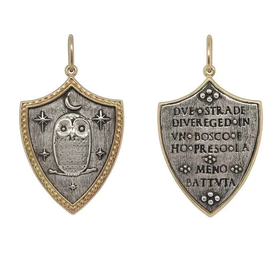 From Erica Molinari, this charm is made out of sterling silver and 18k yellow gold. The front of the charm features an owl with a crescent moon and stars surrounding it. Engraved on the reverse side in Italian is the phrase "Due strade Diveredged in un bosco e ho preso la meno battuta," which translates to "Two roads diverged in a wood and I took the one less traveled" by Robert Frost. This image shows the front and back of the charm.