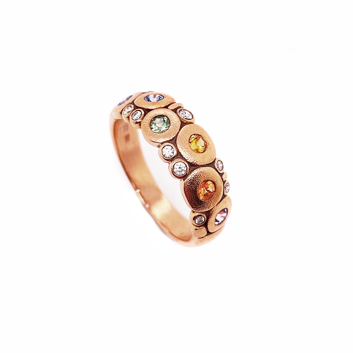 Alex Sepkus' classic dome 'Candy' band in 18K rose gold set with 6 Rainbow Sapphires totaling .5ct and 9 diamonds totaling .12ct.
