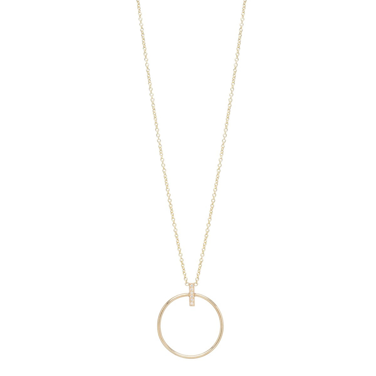 14k gold medium circle and bar necklace from Zoe Chicco with a white pave diamonds set down the bar.