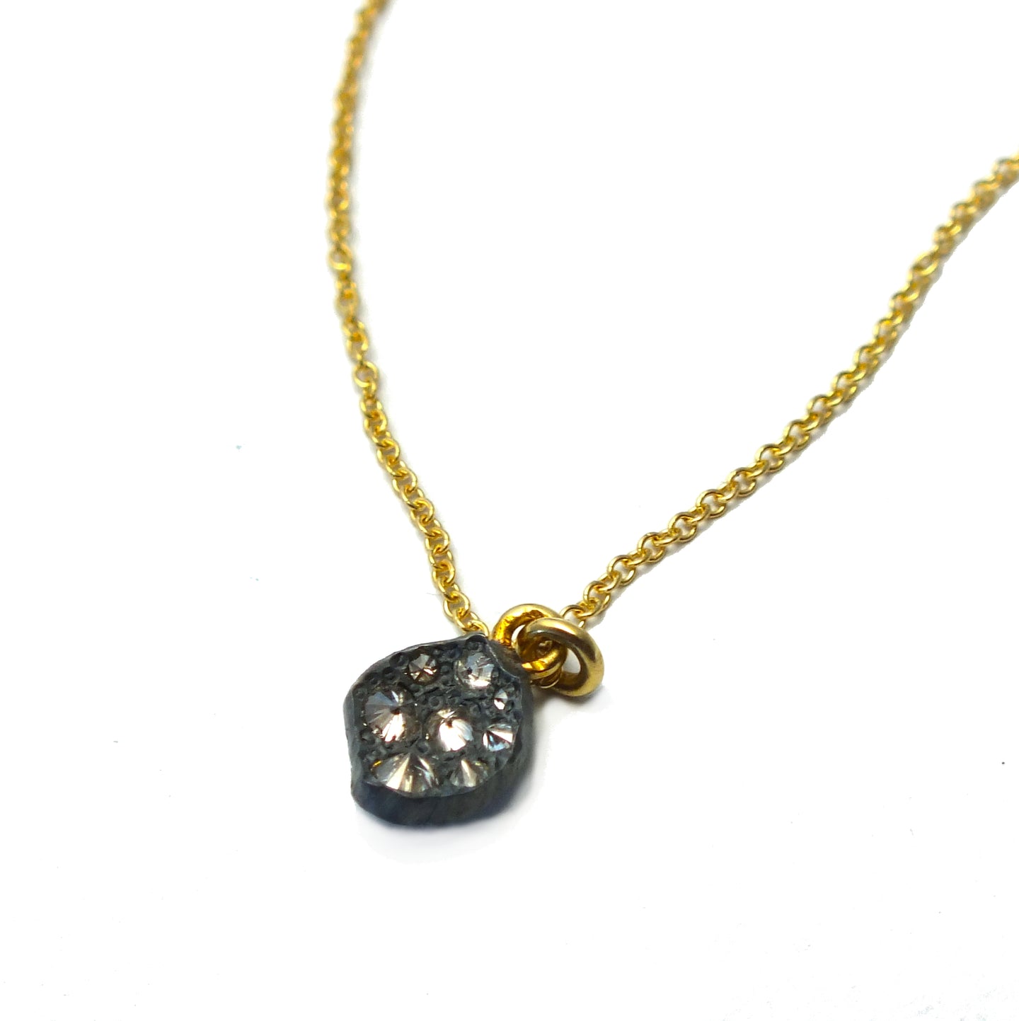 From TAP by Todd Pownell, a delicate, oxidized concave oval pendant is set with inverted diamonds on an 18k yellow chain.