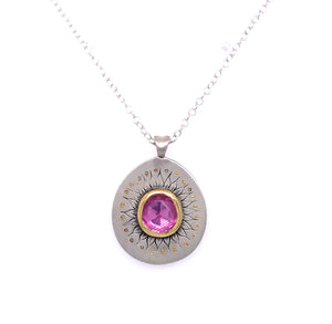 Delicate hand engravings from Adel Chefridi surround a bezel set pink sapphire in 18k yellow gold with 24k dots of yellow gold embellishing the surface.