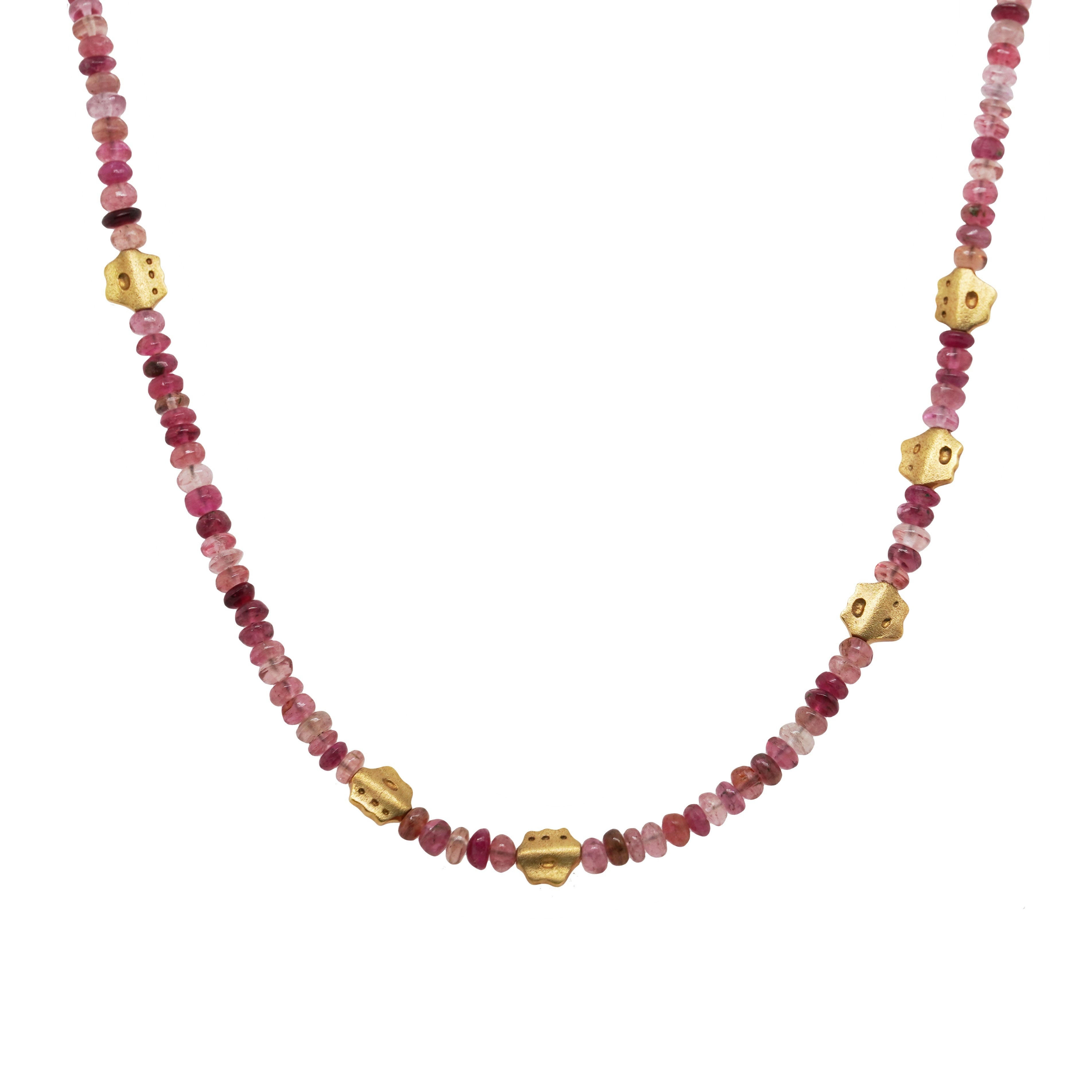 This one of a kind beaded necklace from Alex Sepkus features varying shades of pink tourmalines and 18K yellow gold "Flora" bead stations.