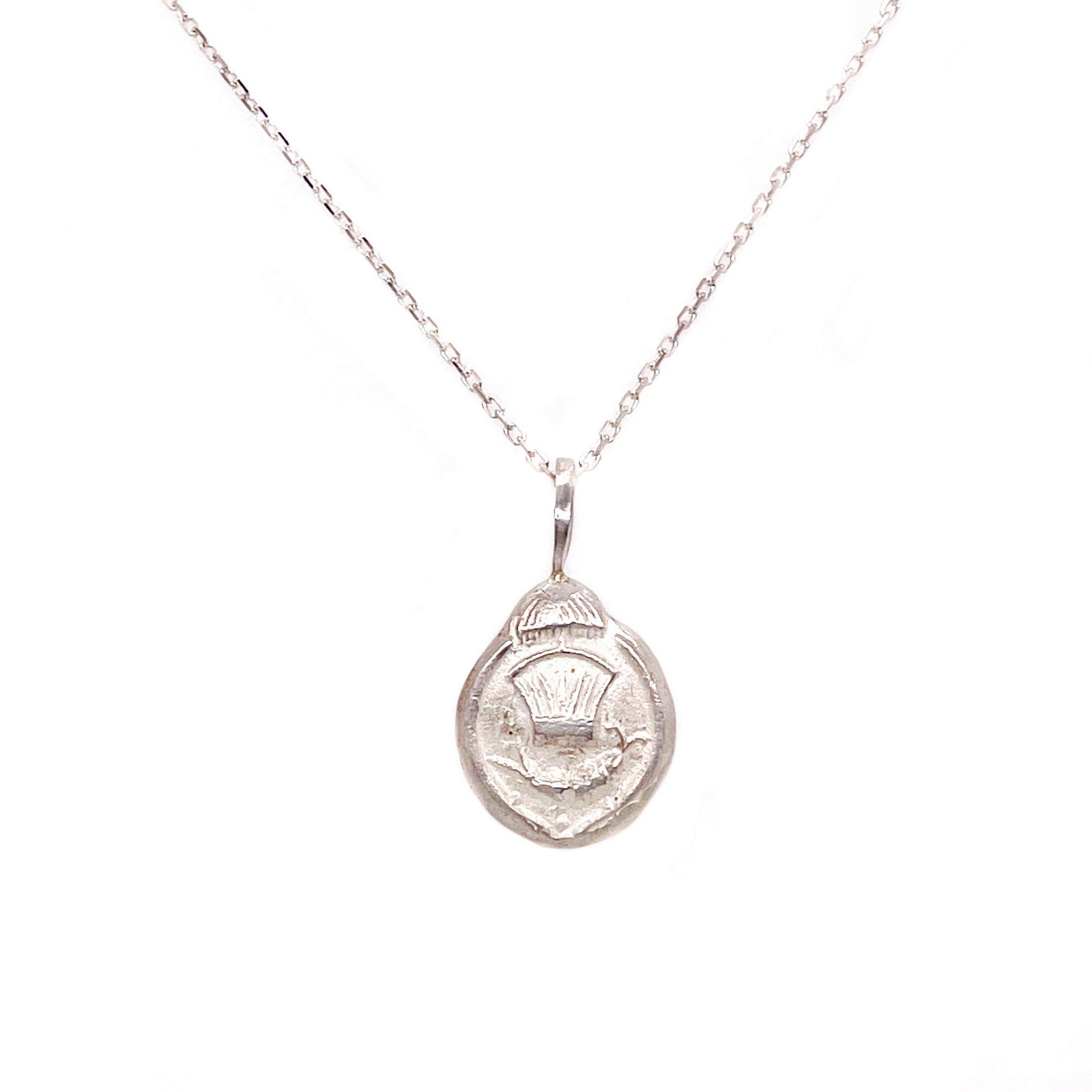 This sterling silver necklace from Robin Haley features a pendant cast from an ancient coin originating from North India circa 1840.