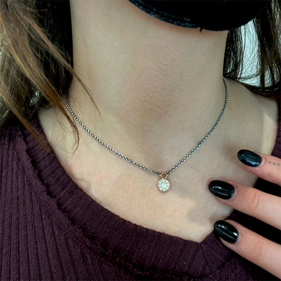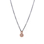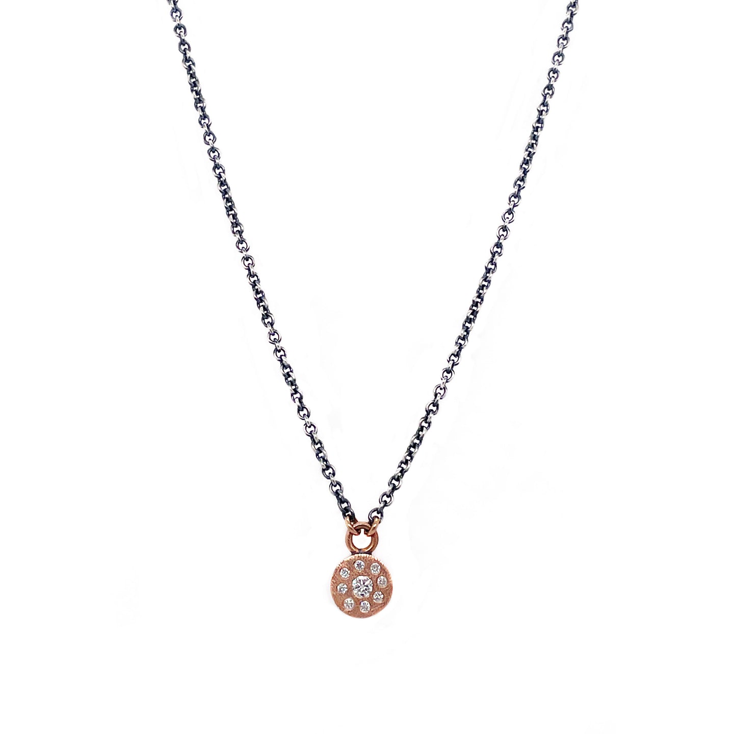 The Ronde XSM Necklace by Rene Escobar is made out of 18k rose gold on a 16 inch stainless steel chain with 0.13 tcw white diamonds.