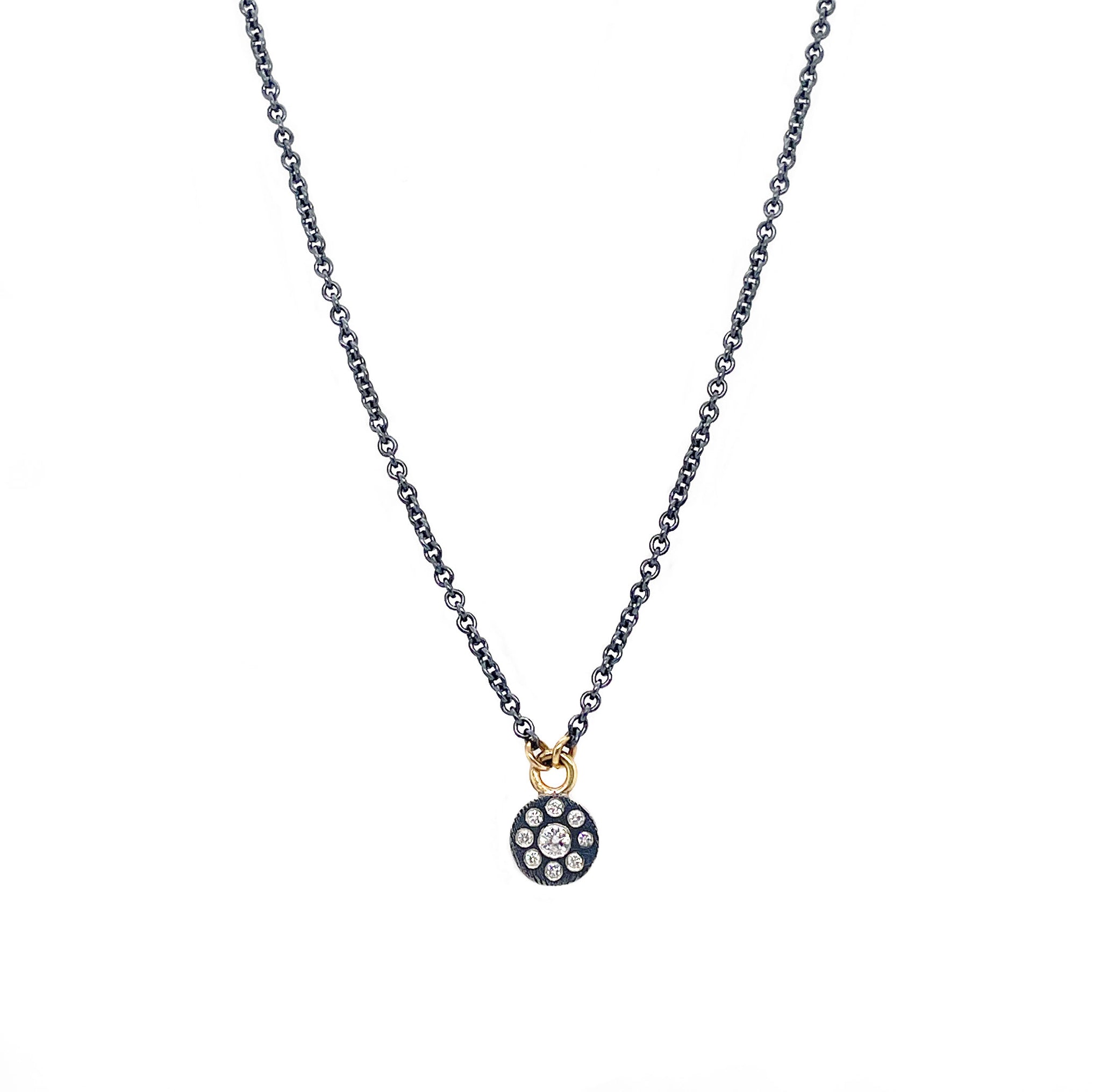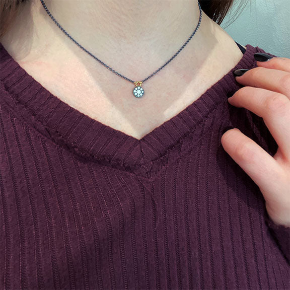 The Ronde XSM Necklace by Rene Escobar is made out of sterling silver and 18k yellow gold on a 16 inch stainless steel chain with 0.13 tcw white diamonds.