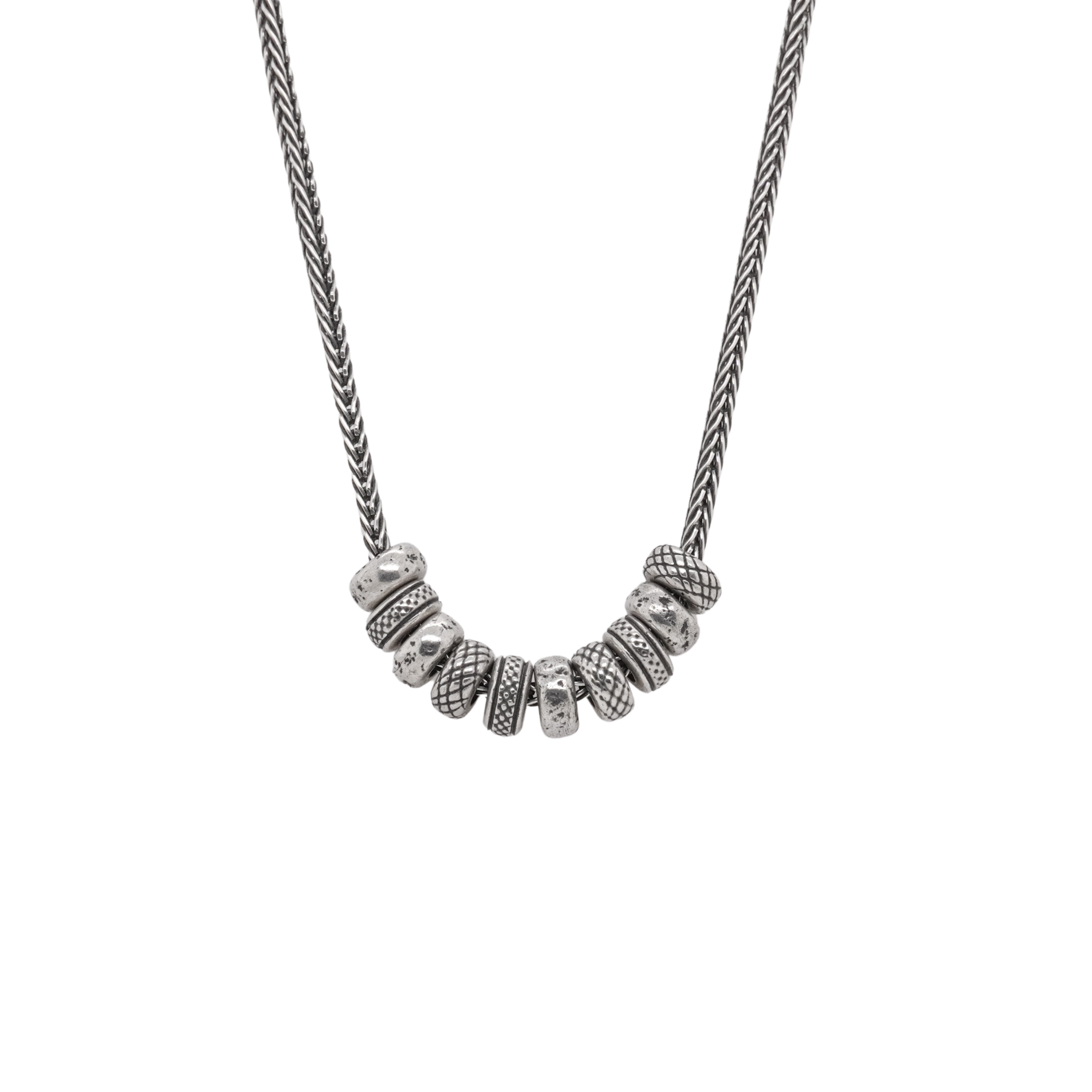 From John Varvatos, this necklace is made out of textured and oxidized sterling silver featuring 8mm rondelle beads strung on a substantial silver chain.