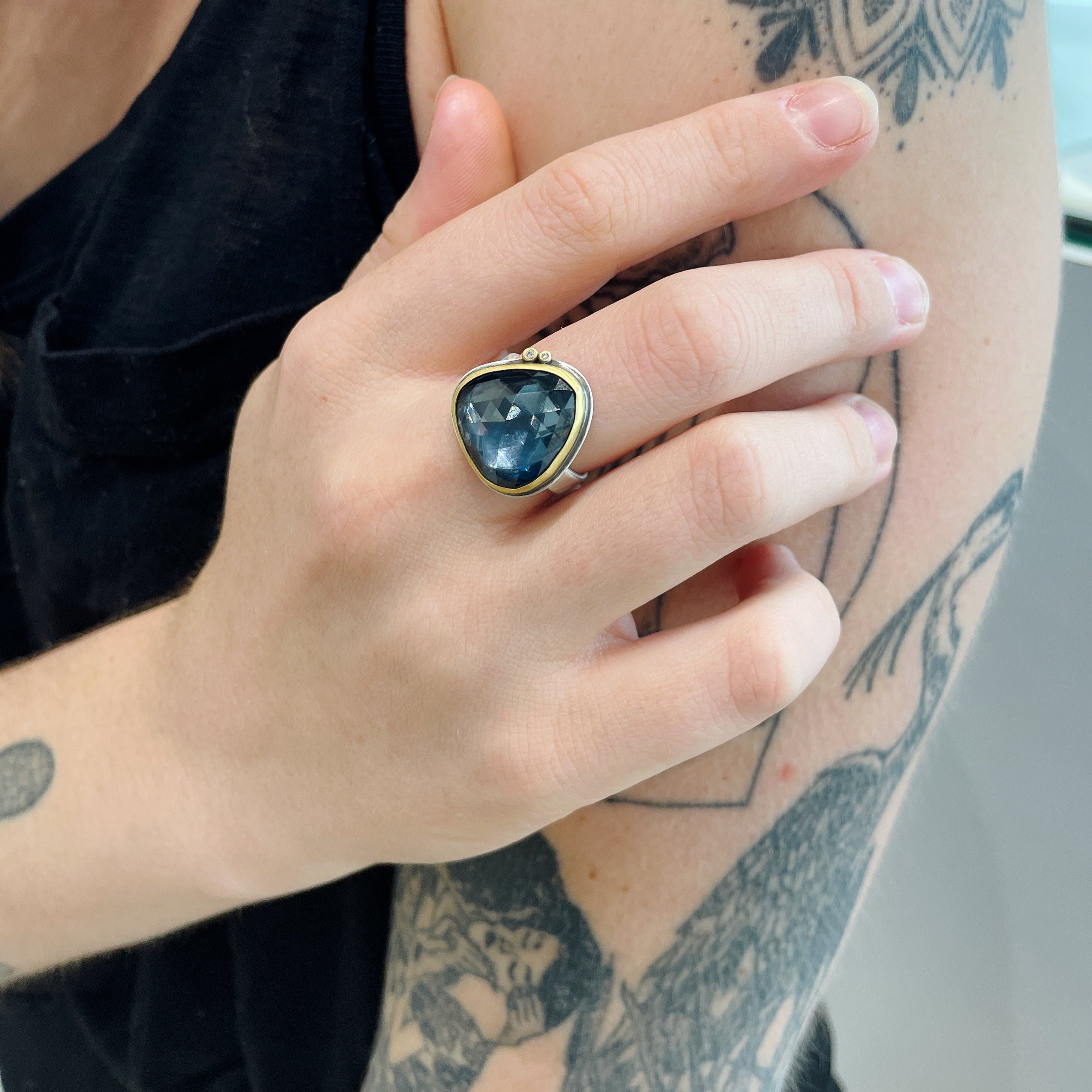This stunning deep blue London topaz ring from Ananda Khalsa will have you swimming in bliss. This rose cut stone is set in a 22K yellow gold bezel with 2 diamond accents and a sterling silver band.