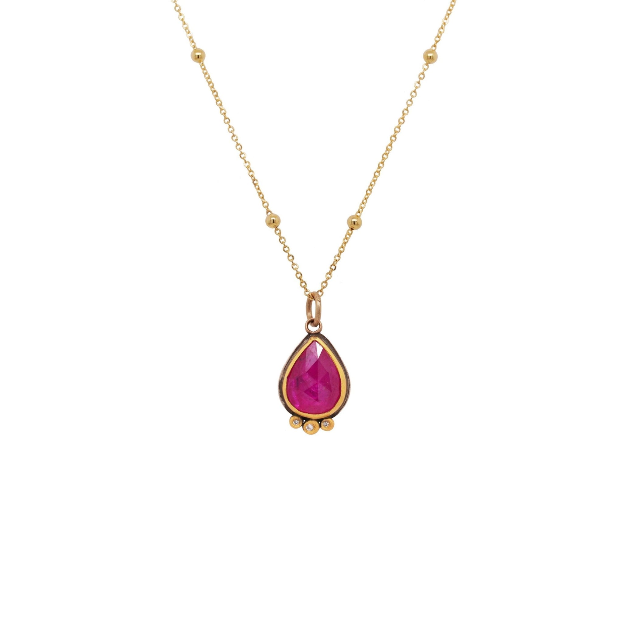 This beautiful necklace by Ananda Khalsa features a stunning rose cut ruby set in warm 22k yellow gold with an oxidized sterling silver back and three sparkling white diamond accents. The pendant hangs from a 16" 14k yellow gold bead chain.