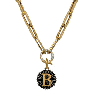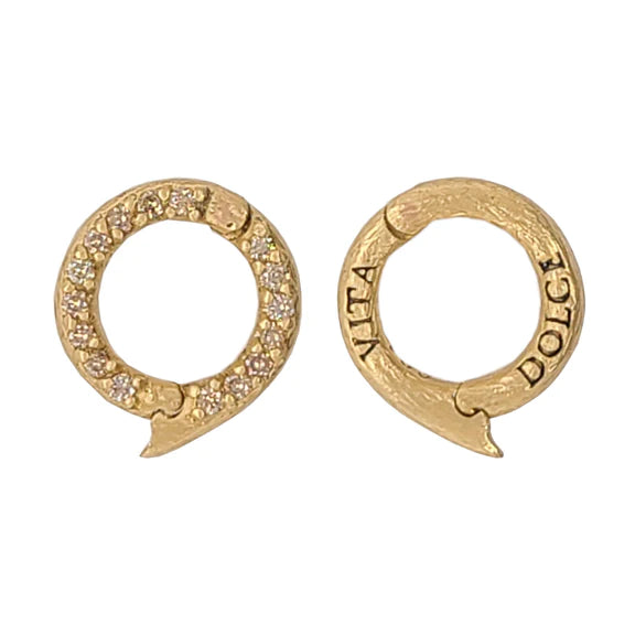 From Erica Monlinari, this charm holder is made out of 18k yellow gold set with .16tcw pave diamonds one one side and the phrase, "dolce vita" or "sweet life" engraved on the other. Can be used as a charm holder on open ended chains or on its own as a charm. This image shows the front and back of the charm holder.