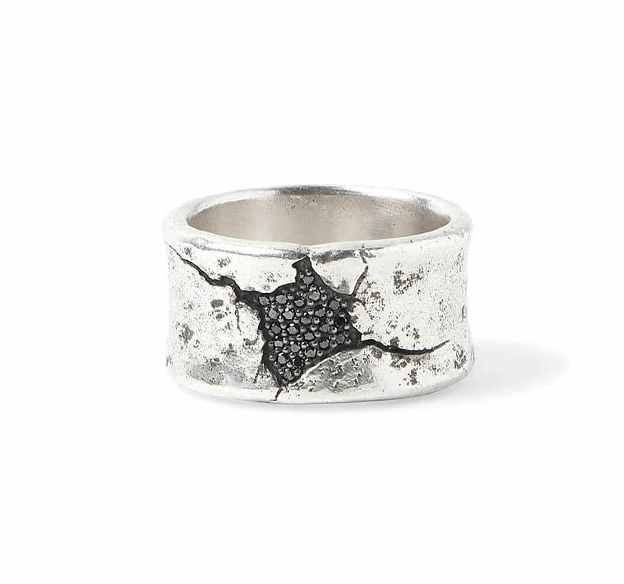 This wide sterling silver ring band is cast with John Varvatos' signature distressed metal pattern and features a large 'crack' like a shattered stone, with a cluster of black diamonds.