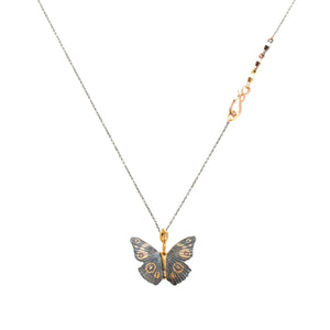 The butterfly hangs from a 18K Yellow Gold "scepter" bail set with a ruby, and an oxidized silver chain.