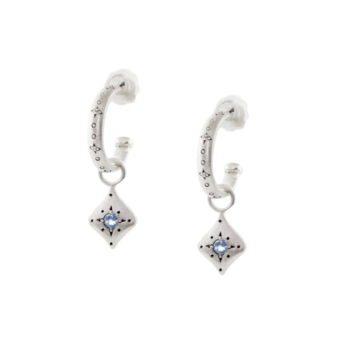 These sweet little hoop studs by Adel Chefridi are made out of sterling silver with accented etching along the face, features a delicate silver night charm, that can be removed, available with a variety of stone options.