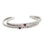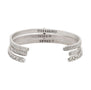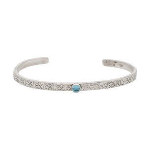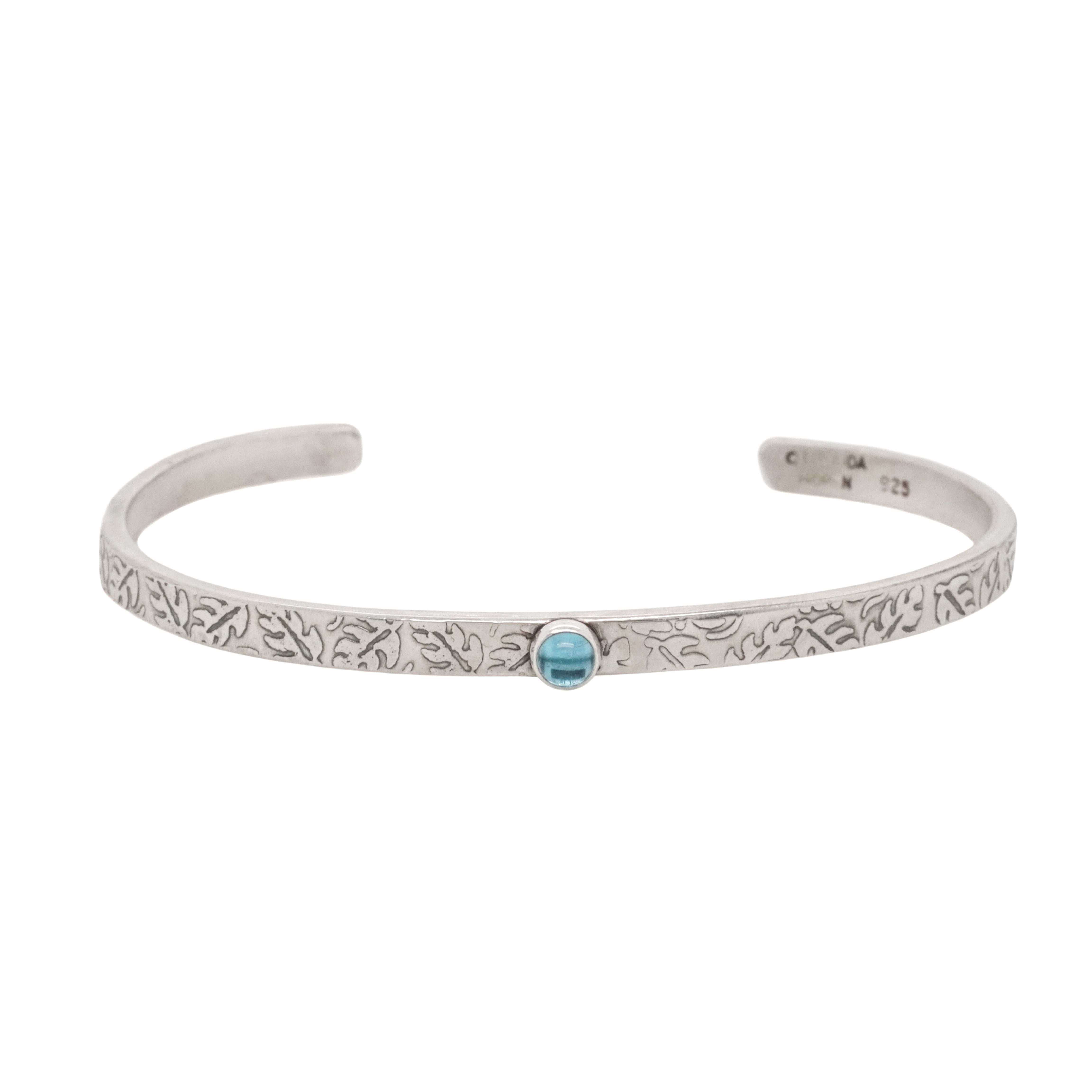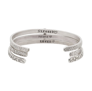 From Lucinda Moran, your choice of a single bezel set cabochon stone sits atop a sterling cuff bracelet surrounded by a hand stamped textural motif. A single word- "Blessed", "Loved", "Peace", "Adored" or "Cherish" hand stamped on the inside of the cuff.