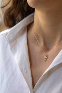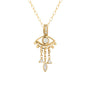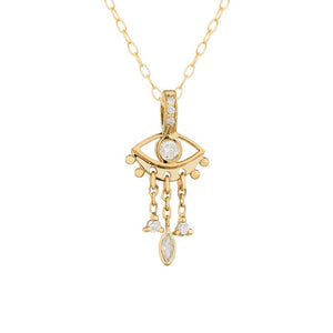 By Celine Daoust, this 14k yellow gold pendant pendant showcases a diamond eye and 3 dangling diamonds.
