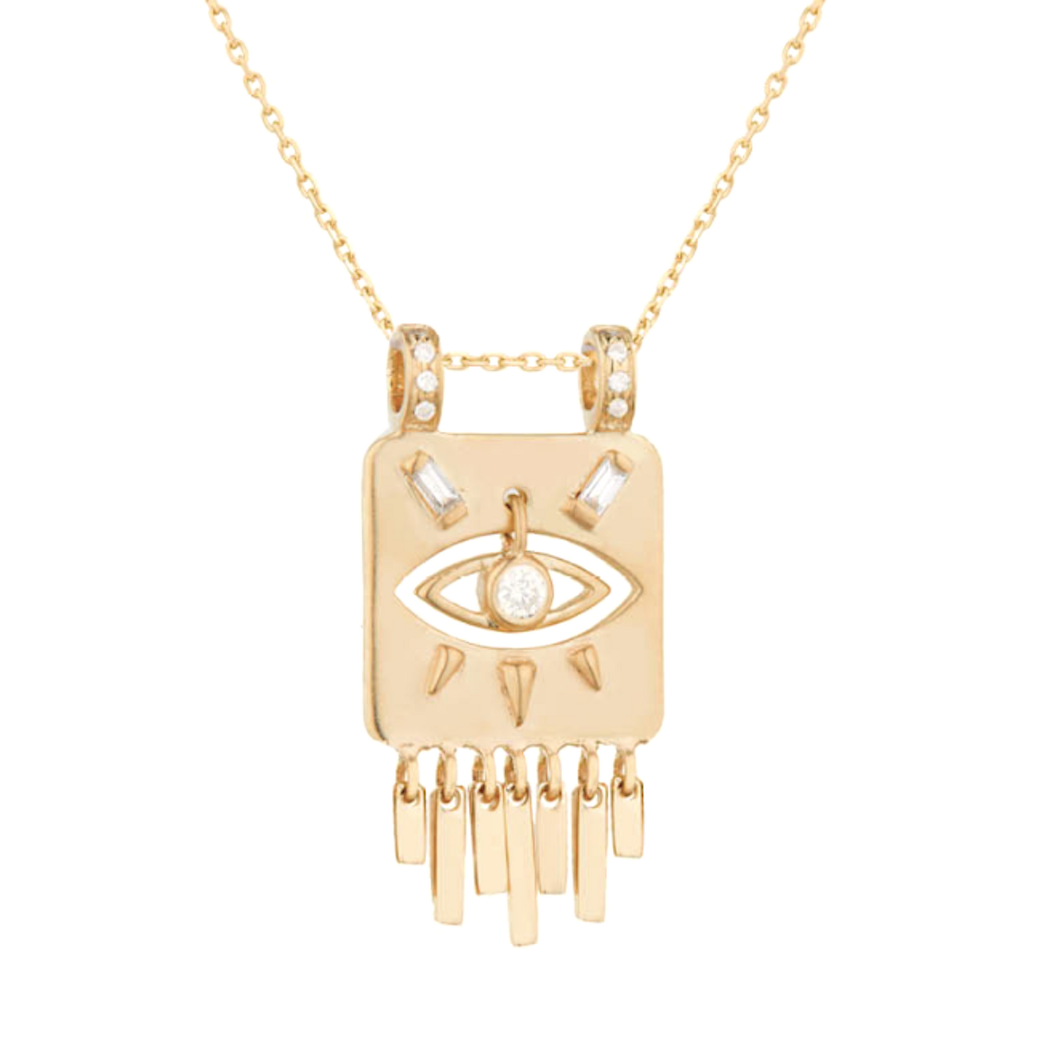 From Celine Daoust, a 14K light yellow gold pendant necklace with a diamond eye and dangling gold details.