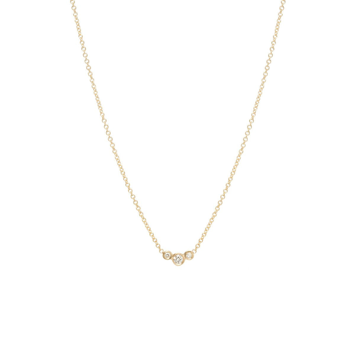 14K rose gold chain with 3 small graduated curved bezeled diamonds from Zoe Chicco.
